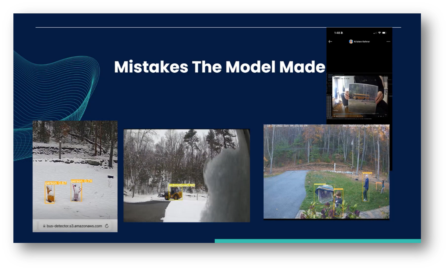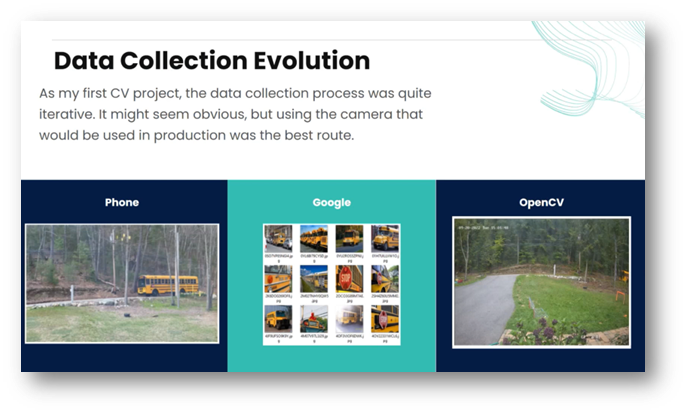 This project presented a unique challenge due to its reliance on a bus that passed by Kristen’s house only a few times a day, which contrasts with the convenience of easily accessible online datasets. She added that she found herself holding up a picture of the bus, hoping to observe its operation in real-time, which was crucial for making necessary adjustments. Overall, the duration of this process spanned about six to seven months, and Kristen believes that different use cases would yield varying timelines.