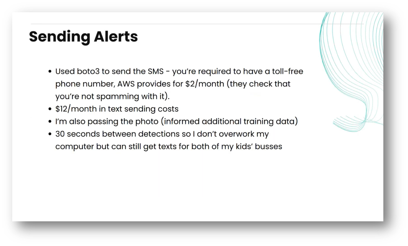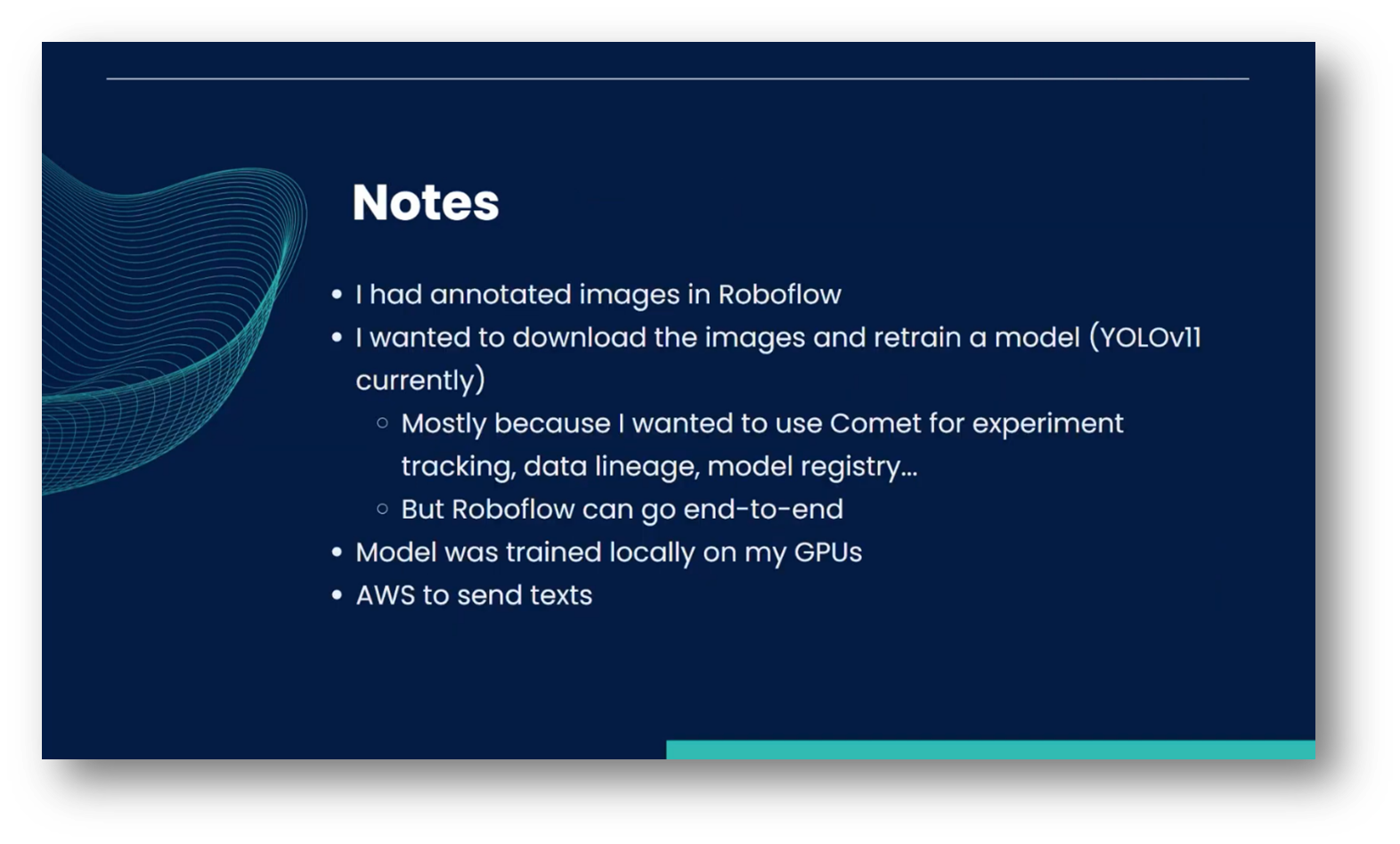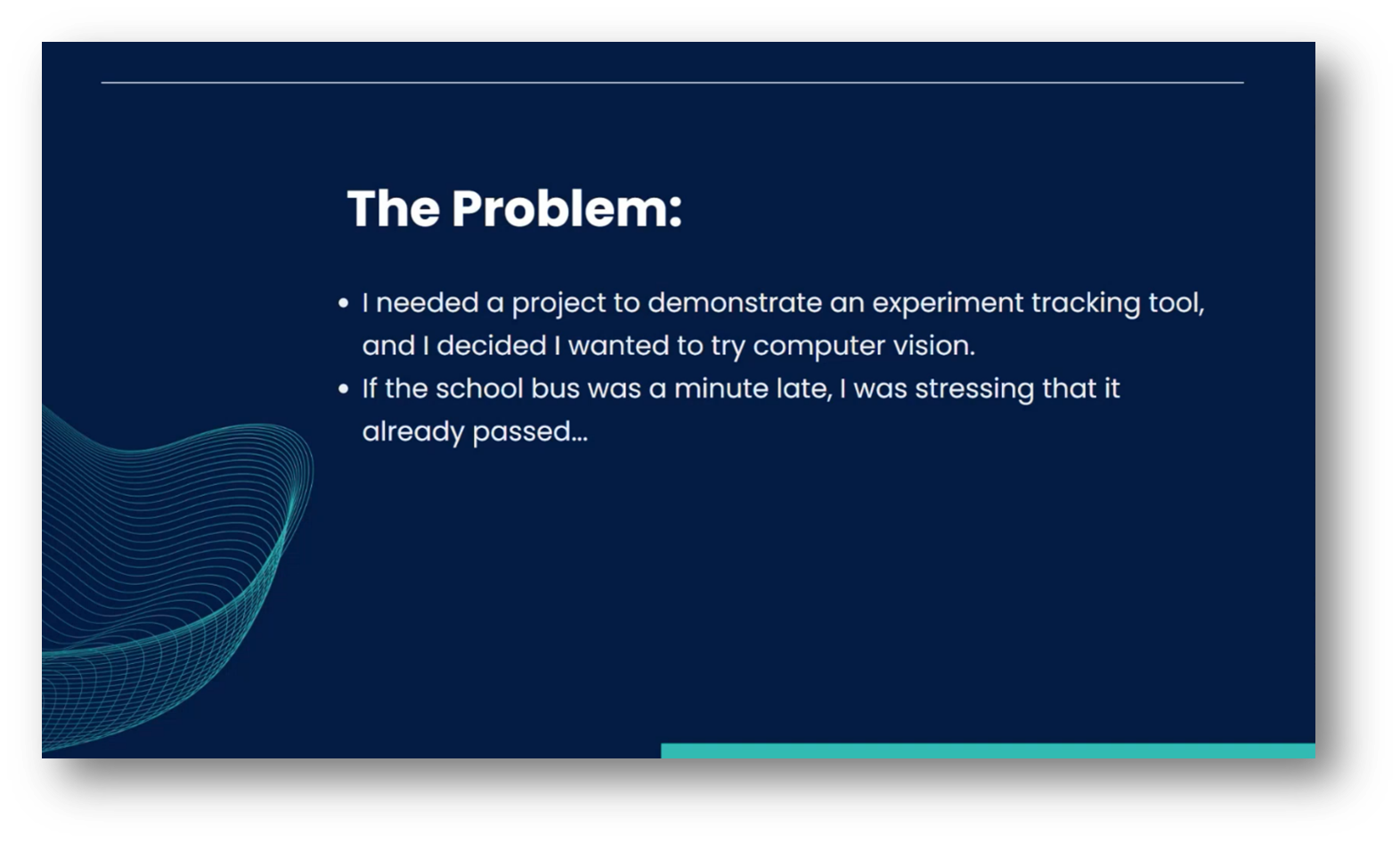 In 2022, Kristen began working at Comet, a company specialising in experiment tracking and ML Ops, where she served as a developer advocate. Her goal was to create a project that effectively demonstrated the practicality of these concepts. Inspired by the popularity of computer vision applications, such as pose estimation and object detection, Kristen decided to explore this field despite my lack of prior knowledge. Additionally, she aimed to develop a solution that would simplify the daily routine of waiting for her daughter's school bus, which arrives at the end of her driveway, allowing Kristen to monitor it without needing to look out the window constantly.