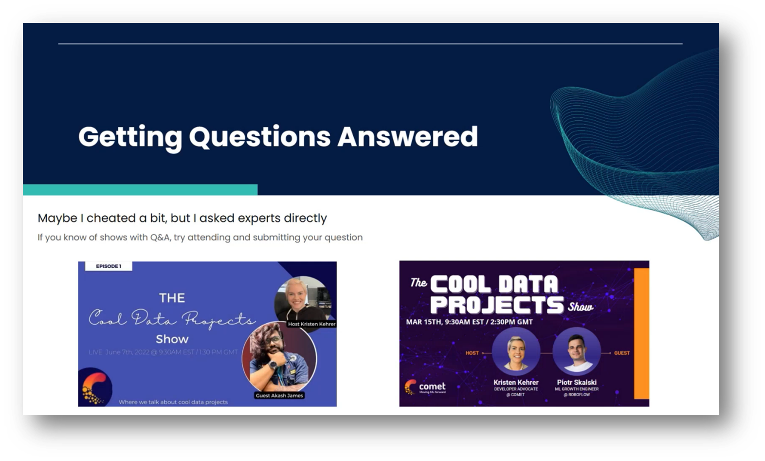 Kristen then found success with implementing OpenCV to train the model with real-world images from her environment, recognising the importance of using relevant data instead of generic online images. Although initially hesitant about data collection methods, they pivoted to learning from experts in the field by hosting a show called "Mavens of Data."