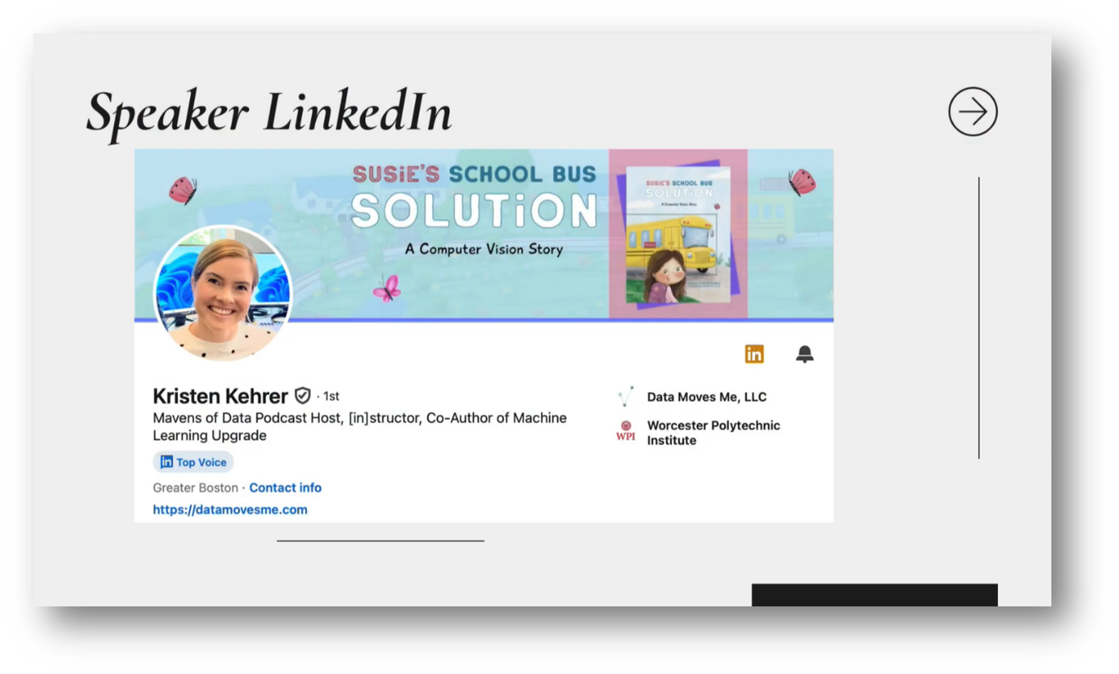 After starting her freelance consulting business, Data Moves Me, in 2018, Kristen expanded her professional repertoire, serving as an instructor at UC Berkeley Extension, creating course content for the data science programs at Dartmouth and Columbia, and leading the Mavens of Data podcast. This project, which unexpectedly evolved into her third book, ‘Susie’s School Bus Solution,’ showcases her journey of overcoming challenges in a new field.