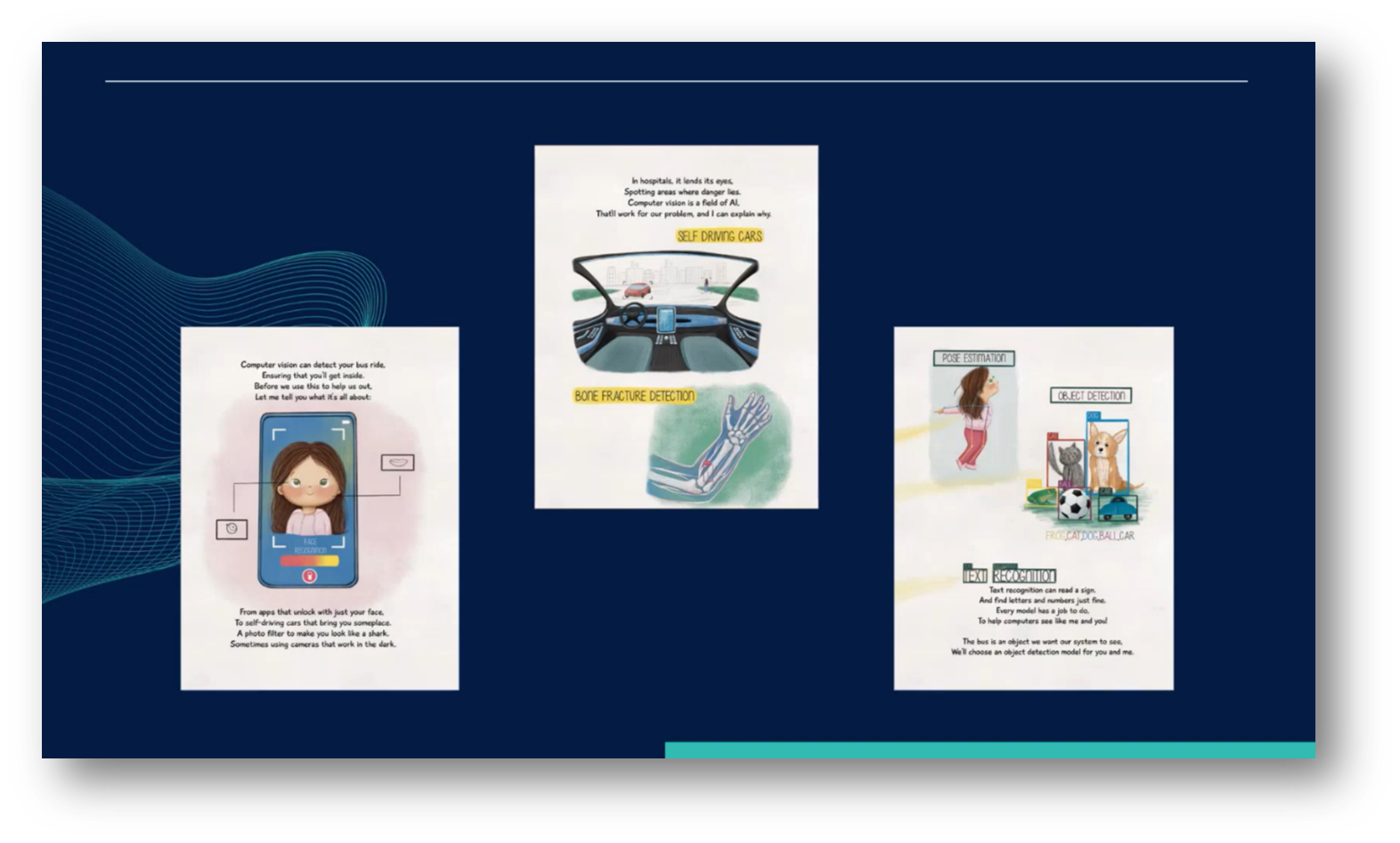 Kristen then discussed the importance of selecting the appropriate computer vision model based on specific problems and goals. It highlights various models, such as pose estimation, which tracks movements like dancing, and text recognition, which effectively reads signs and symbols. The main takeaway is that each model has a dedicated function to help computers better understand visual information, emphasising the need to align model selection with desired outcomes. Ultimately, the book concludes with Susie and her mother proudly resolving their daily issue of missing the bus, illustrating the practical benefits of applying the right technology.