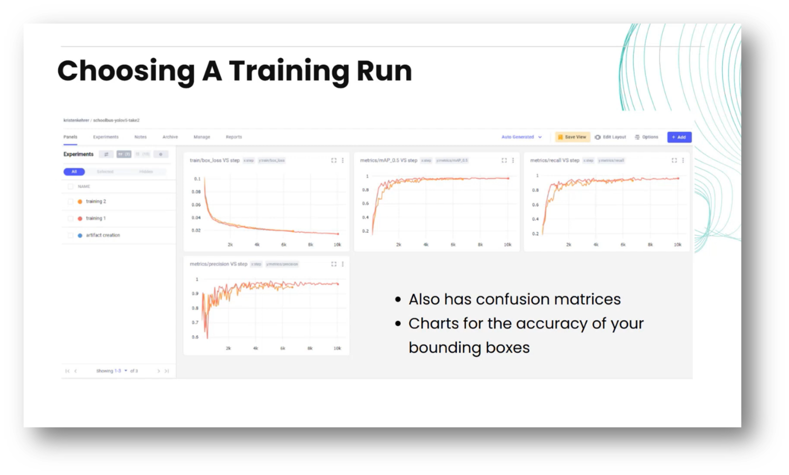 Kristen noted that the process includes evaluating the true bounding box of images against predicted bounding boxes and analysing confusion matrices to determine the best-performing model. Ultimately, this streamlined approach allows for confident decision-making about which model to deploy in production.