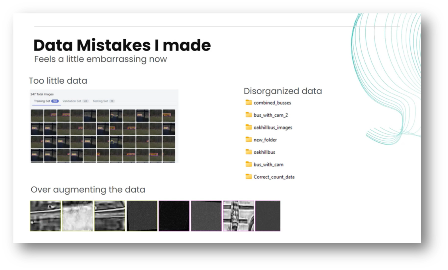 Kristen initially tested 247 images to evaluate the feasibility of her approach before fully committing to data preparation. However, the initial model proved ineffective due to a lack of augmented data. She noted that for those new to computer vision, platforms like Roboflow offer user-friendly options for various types of data augmentation, such as black and white conversion and scaling. Caution is advised, as it's easy to produce poor-quality data quickly if not careful with these augmentations.