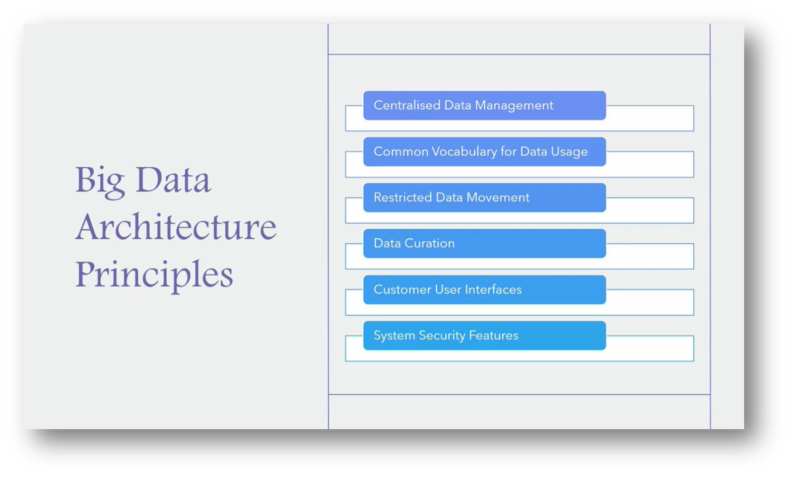 Big Data architecture principles emphasise centralised Data Management, commonly represented by a data lake that serves as a unified repository using a common vocabulary while minimising data movement. Snowflake exemplifies these principles by eliminating data copying and instead offering different views of the same dataset.