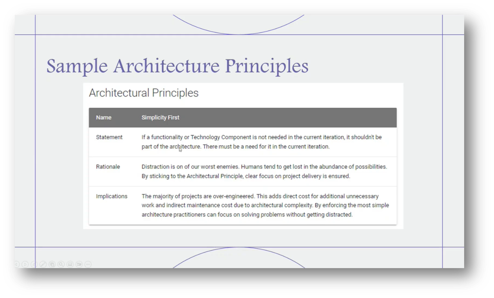 Architectural principles are crucial for guiding design decisions at a fundamental level. One notable example is the principle of "Simplicity First," which states that if functionality is not required in the current iteration of a project, it should not be included in the architecture. This principle aims to reduce overengineering, thereby minimising unnecessary costs and workloads.