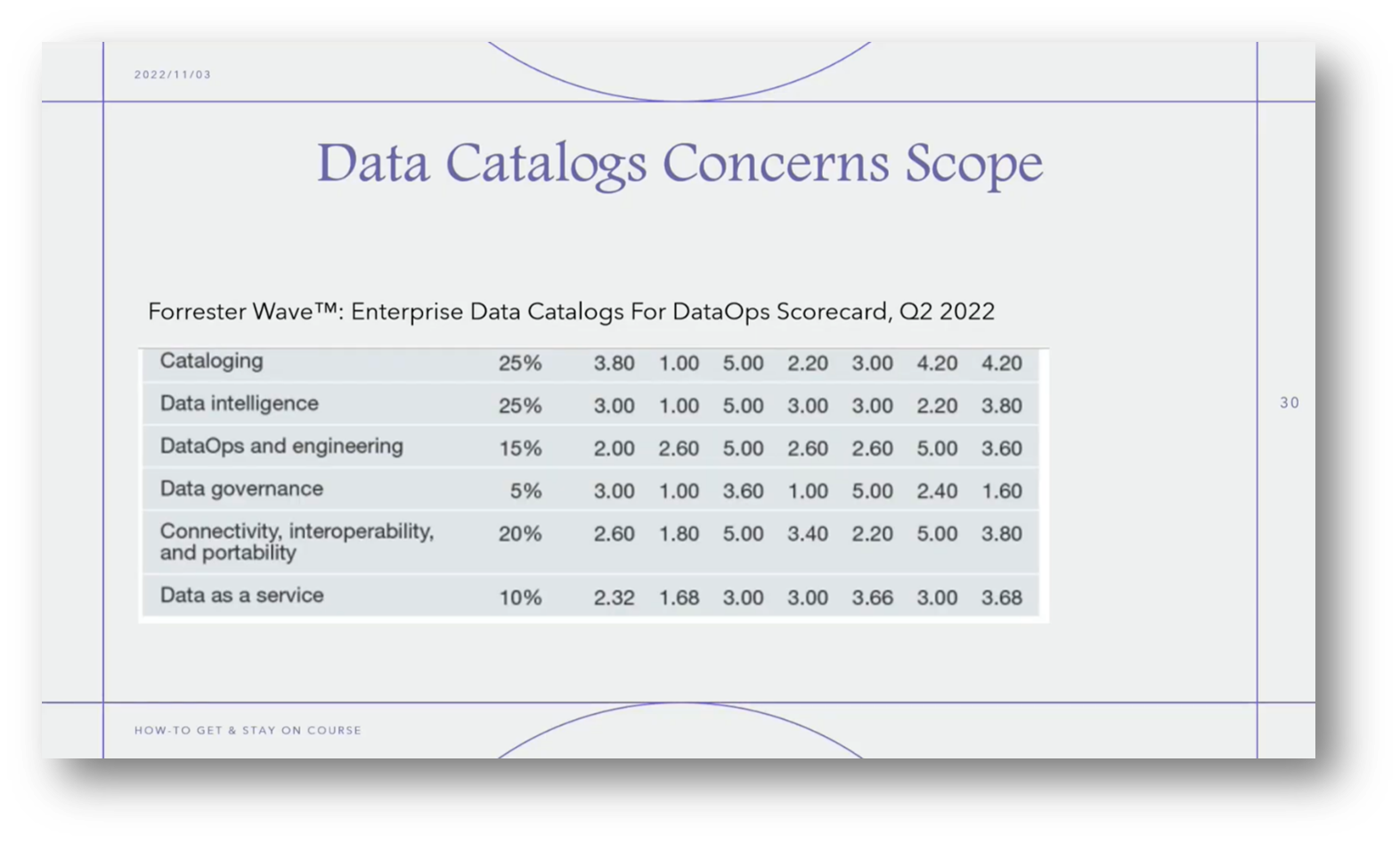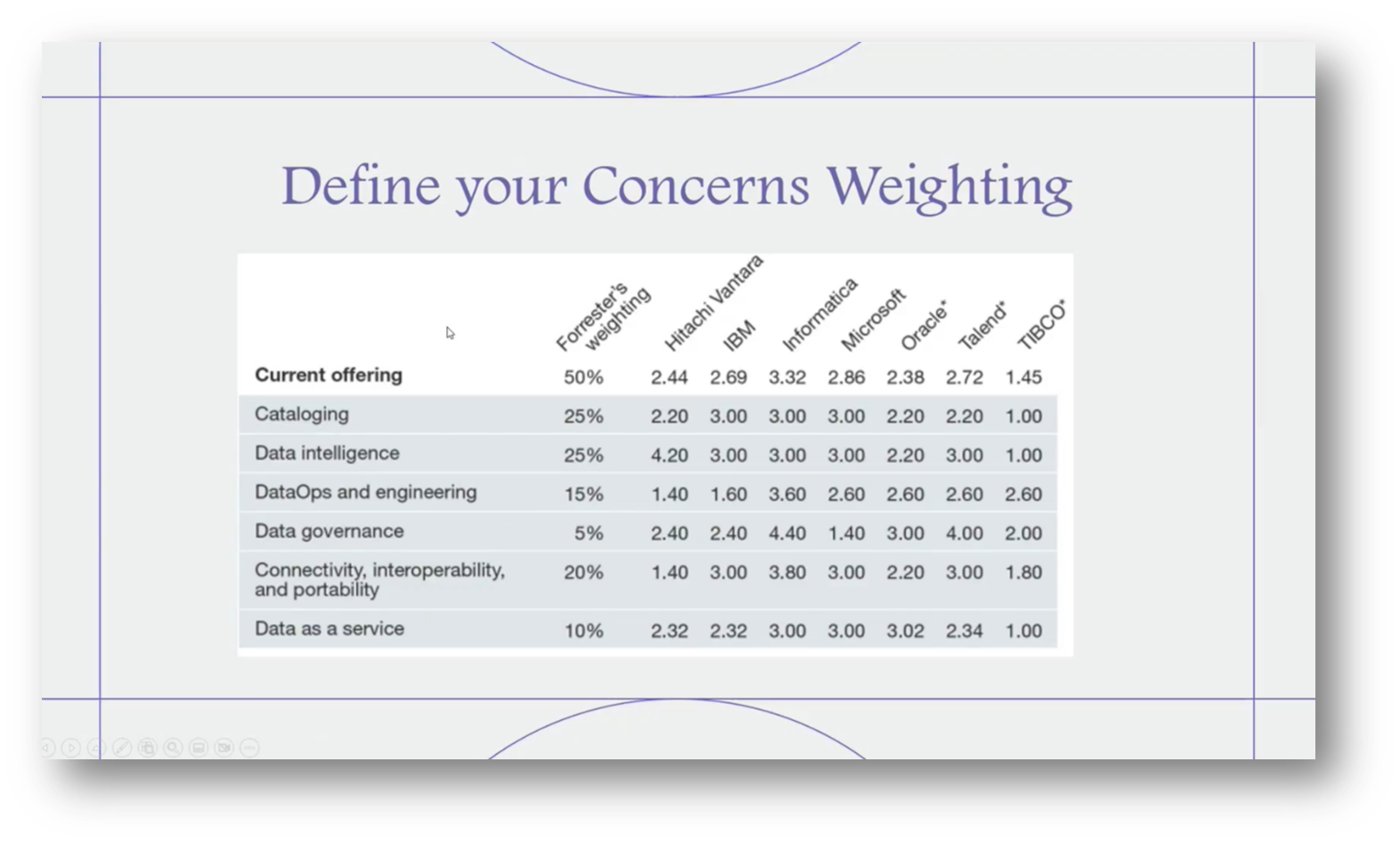 In evaluating data catalogue solutions, it's essential to consider the assessment criteria outlined by Forrester and Gartner, which emphasise specific features that influence product ratings. For instance, my weighted priorities include cataloguing (25%), Data Intelligence (25%), data operations and engineering (15%), connectivity (20%), Data as a Service (10%), and Data Governance (5%). Additionally, by using these weightings, organisations can effectively communicate their requirements to vendors like IBM, Informatica, or Microsoft, obtaining scores based on the features that matter most to them.