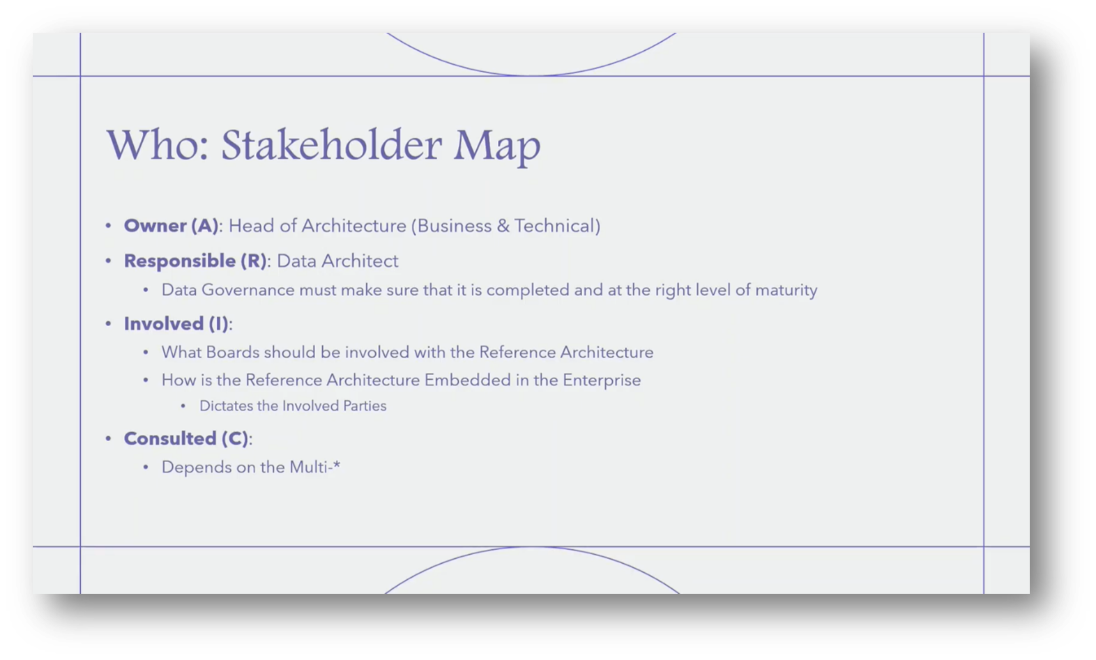 The responsibility for building the Reference Architecture for Data Management typically falls to the head of architecture, with the data architect playing a crucial role in its development and implementation. This process involves collaboration between Data Governance, Enterprise Information Management (EIM), and architecture to ensure the architecture meets necessary maturity levels and addresses concerns across various Data Management practices. Additionally, it is essential to present the architecture to an architecture board, if available, and understand how the Reference Architecture will be integrated into the enterprise structure, which may include multiple sites, organisations, vendors, or departments. The organisational setup will dictate the stakeholders that need to be involved in the development process.