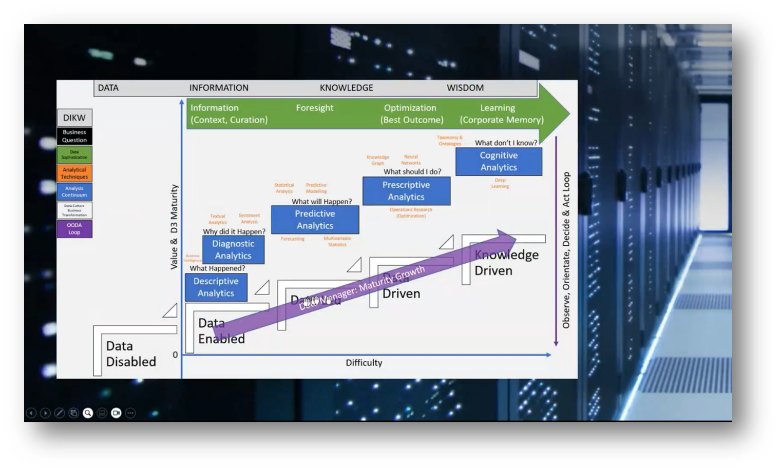 Analysts should focus on providing a range of options rather than a single answer, utilising optimisation to assess the pros and cons to inform decision-making. Howard references the DIKWA (Data, Information, Knowledge, Wisdom, Action) model, which underlines the importance of enhancing data maturity to answer more complex questions effectively.