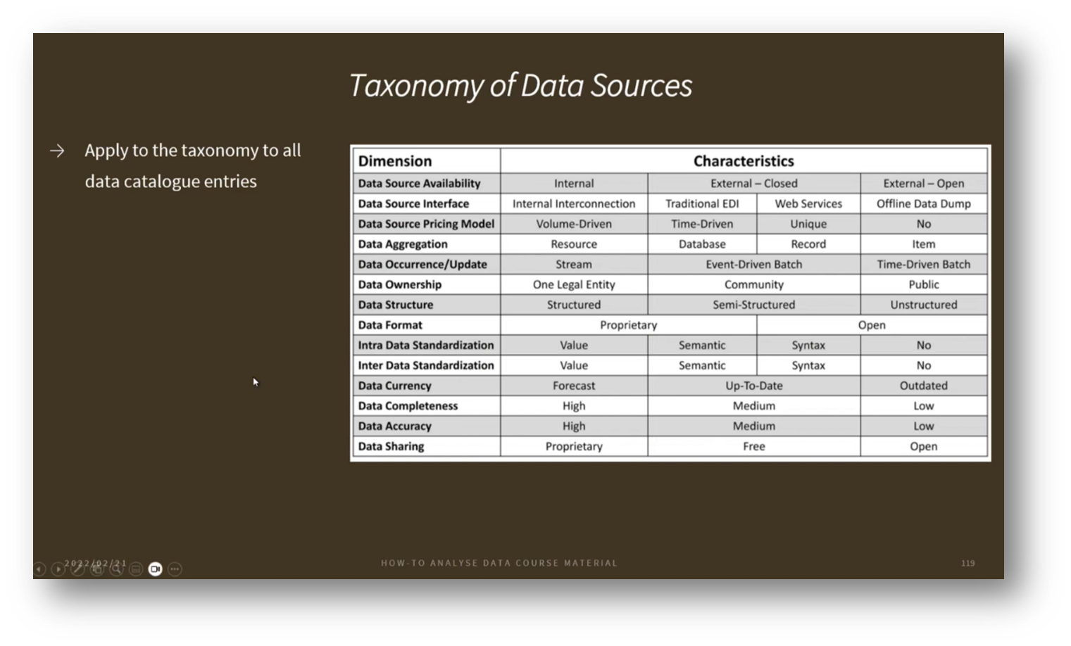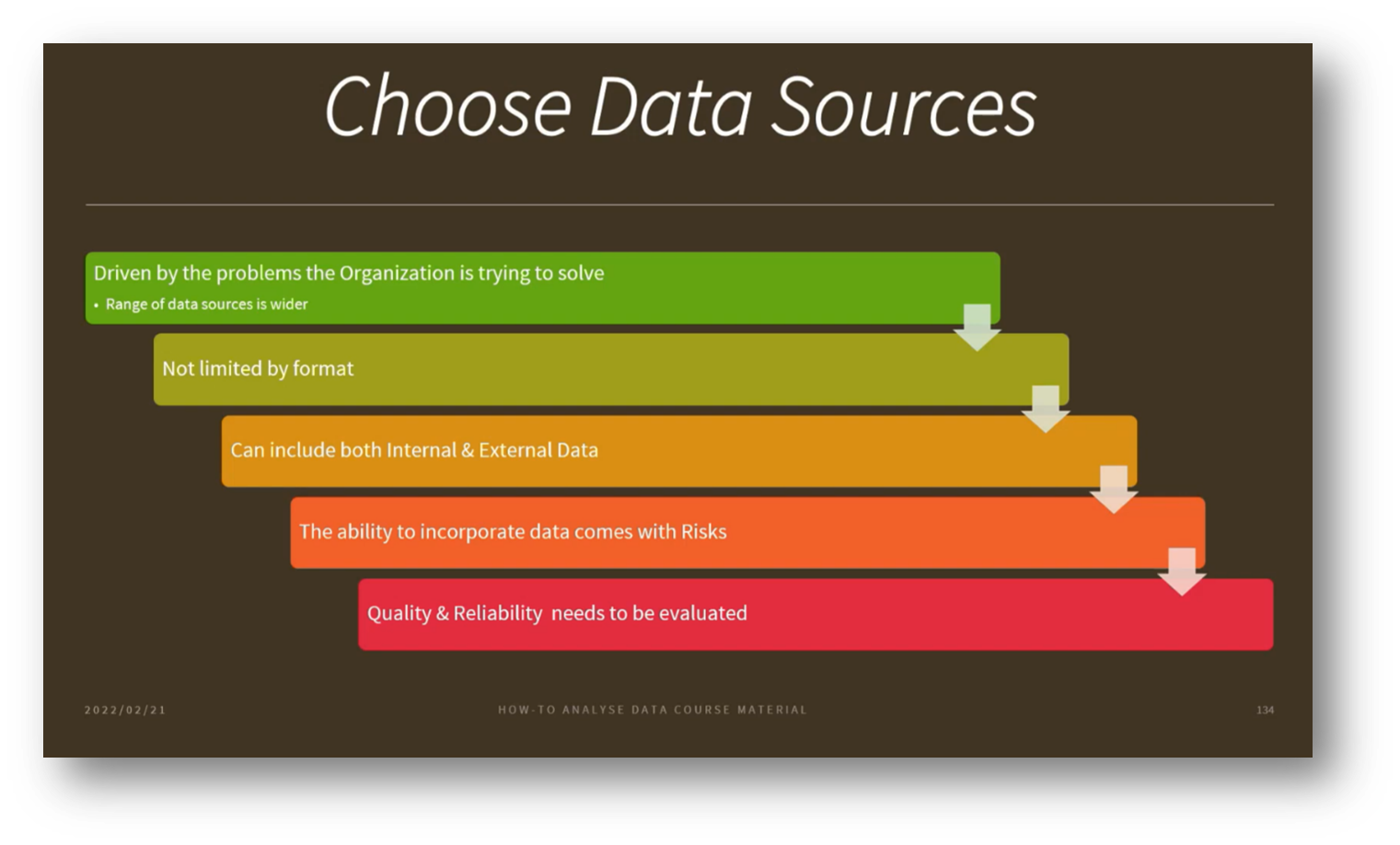 When choosing data sources, it's essential to consider various factors such as the type of data (internal web data, synthetic human-generated data, machine-generated biometric data), as well as the provenance, frequency, hardware requirements, and governance surrounding data acquisition.