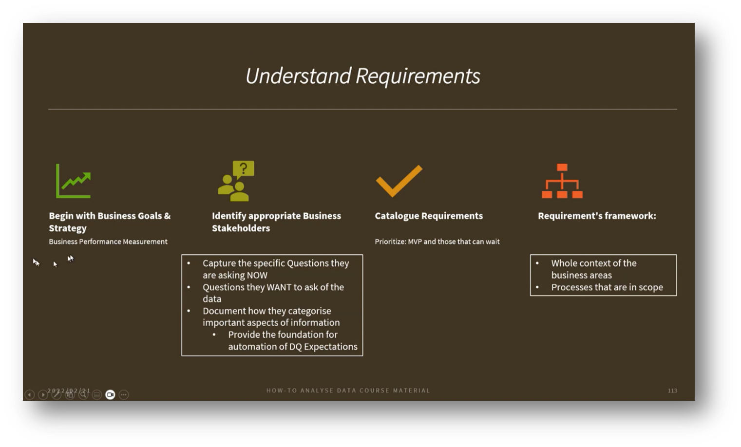 The ABI (Analytics Business Intelligence) process involves understanding business goals, strategy, and performance to effectively measure metrics such as budget versus actual results. While BI excels in performance measurement, it often struggles to explain underlying reasons for trends, such as declining sales or customer retention. To address these challenges, it is essential to identify stakeholders for each Key Performance Indicator (KPI) and prioritise data products based on business requirements. This includes building a comprehensive requirements framework and establishing a proper architecture with crucial elements like data lineage and data catalogues. Ensuring that all Metadata is readily accessible empowers business users to trace the origins of report data and seek clarification when needed, ultimately enhancing data asset management.