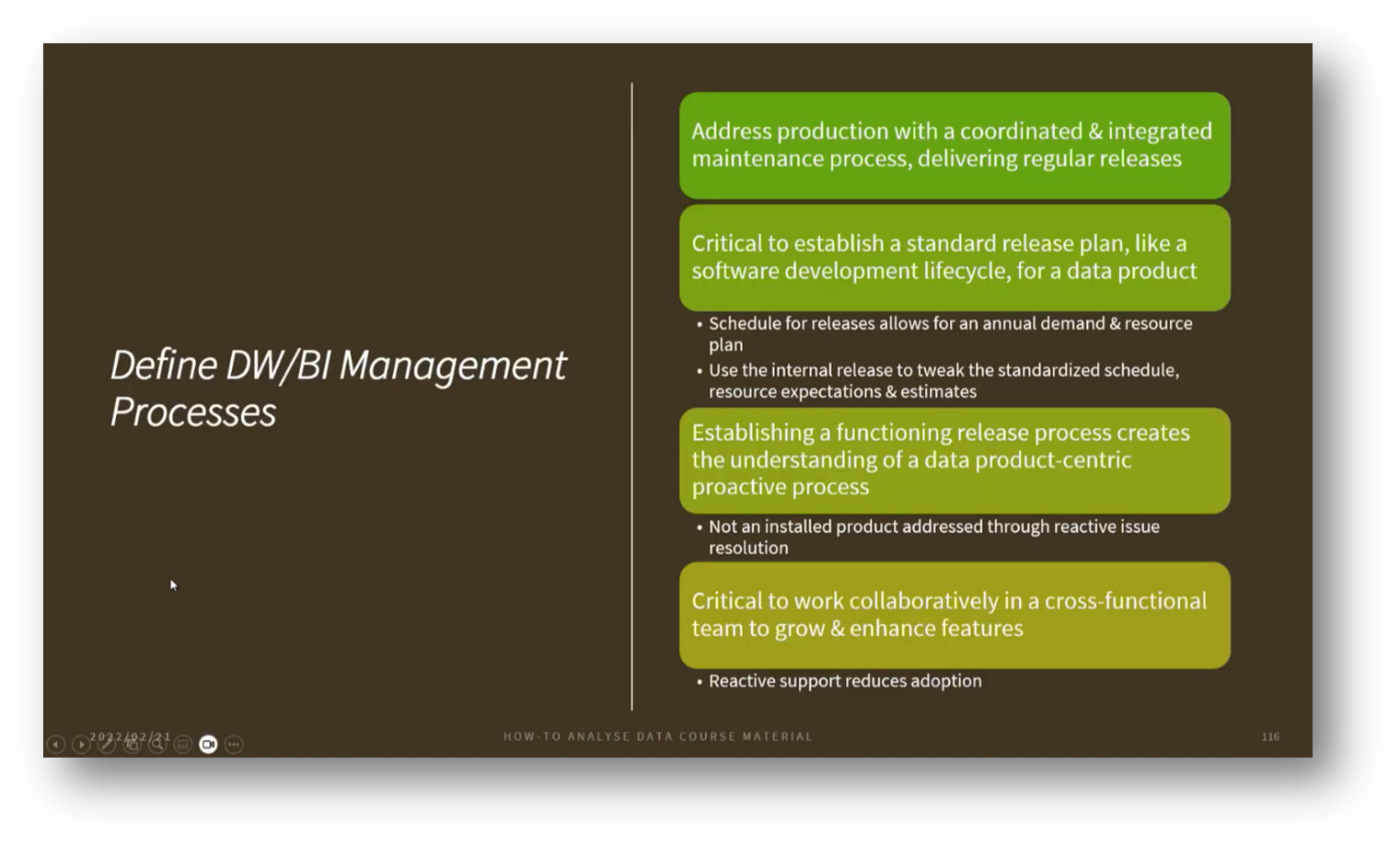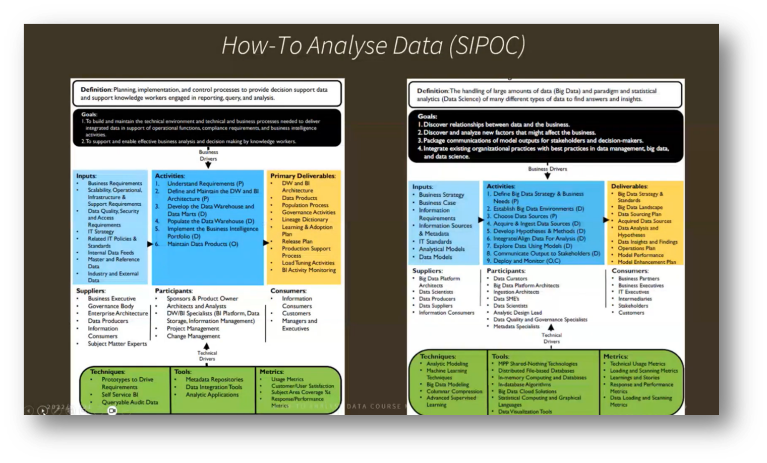 The DMBoK (Data Management Body of Knowledge) framework differentiates between Data Warehousing, Business Intelligence (BI), and Big Data analytics, highlighting the need for rigorous methods to derive insights from large datasets. This includes transitioning from Version 2, which focuses on uncovering unknown questions, to a more structured approach that integrates various stages of data processing. Ultimately, establishing a solid foundation by Data Managers allows teams to focus on necessary analytical work to drive informed decision-making.