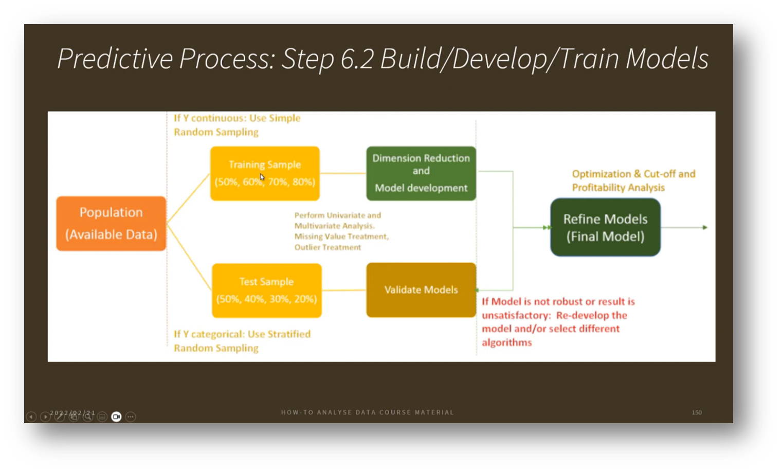 In the realm of predictive modelling, we differentiate between statistical modelling and machine learning models. While statistical modelling often focuses on prediction through approximation, machine learning employs algorithms to analyse decision-making probabilities. Key to these processes is the careful selection of training and testing samples from the available dataset, which can consist of millions of records. For instance, a training-to-testing ratio of 50/50 or 80/20 might be used to ensure the model is adequately trained to produce reliable outcomes. Additionally, techniques such as dimensionality and feature reduction can help streamline the process by minimising the data required for training. Once the model is trained, it is validated using test data, followed by optimisation and refinement as new data becomes available.