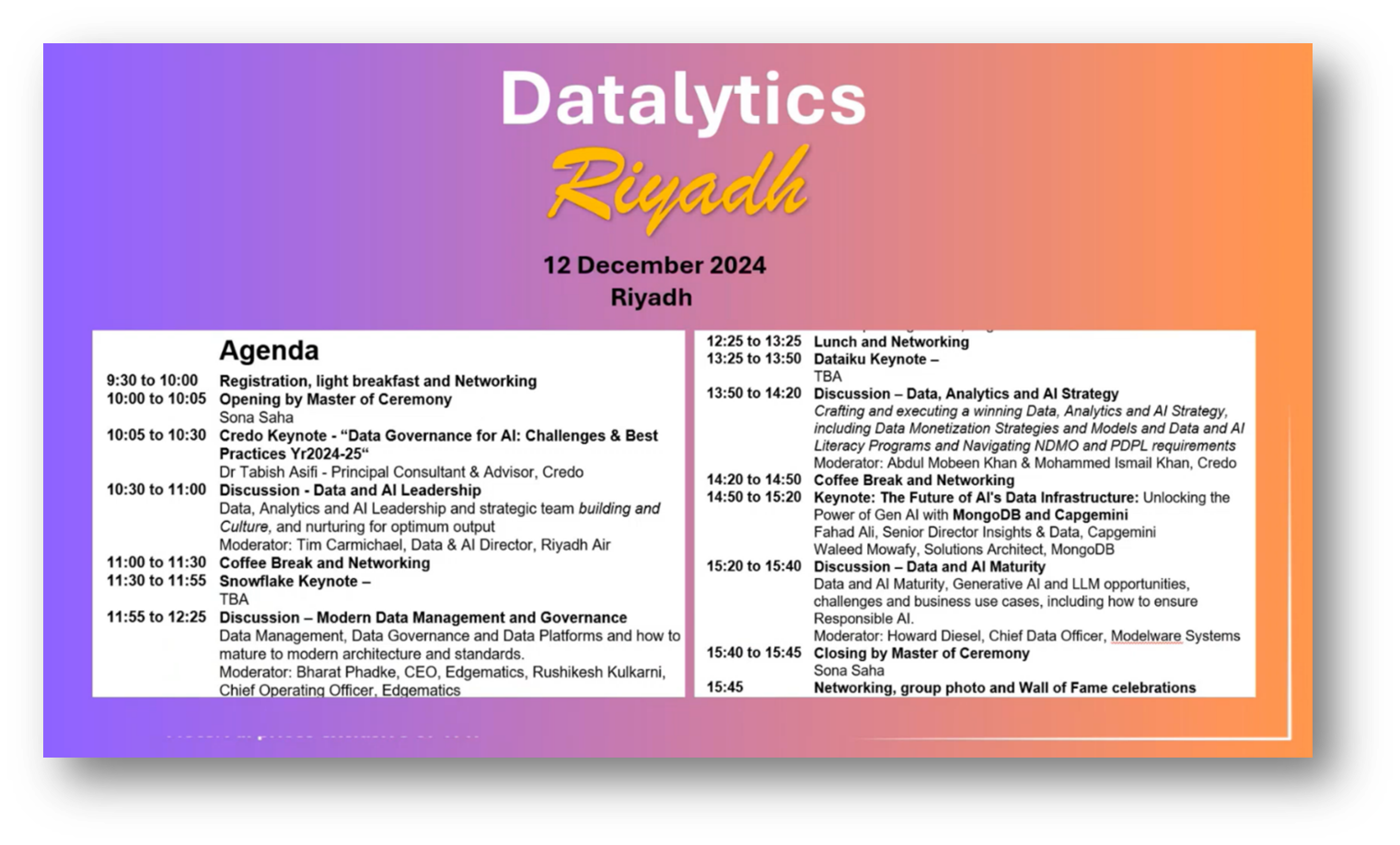The agenda includes a Credo Keynote, discussions on data governance and AI leadership facilitated by Tim Carmichael, a session on modern data management led by Bharat Patka, and a talk on data analytics strategy by Abdul Nabin Khan from Credo. Sona Saha will serve as the master of ceremonies, ensuring a lively and interactive atmosphere throughout the day.