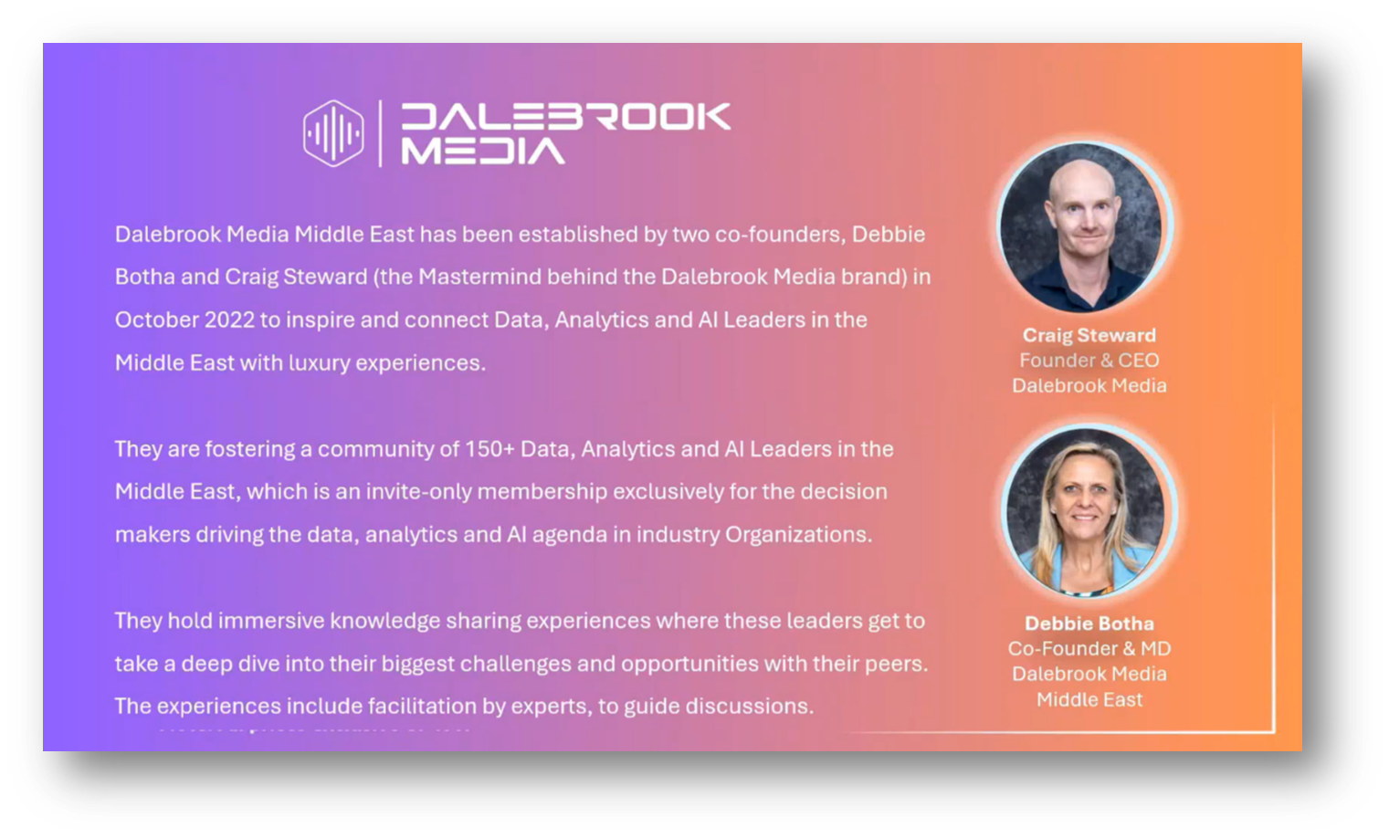The upcoming event in Saudi Arabia on December 12, hosted in Riyadh, promises to be an engaging experience focused on data analytics and AI, featuring active participation from attendees rather than traditional speaking formats. Debbie shares that notable sponsors include Credo as the lead sponsor, along with Data IQ, Snowflake, Mongo DB, Cap Gemini, and others.