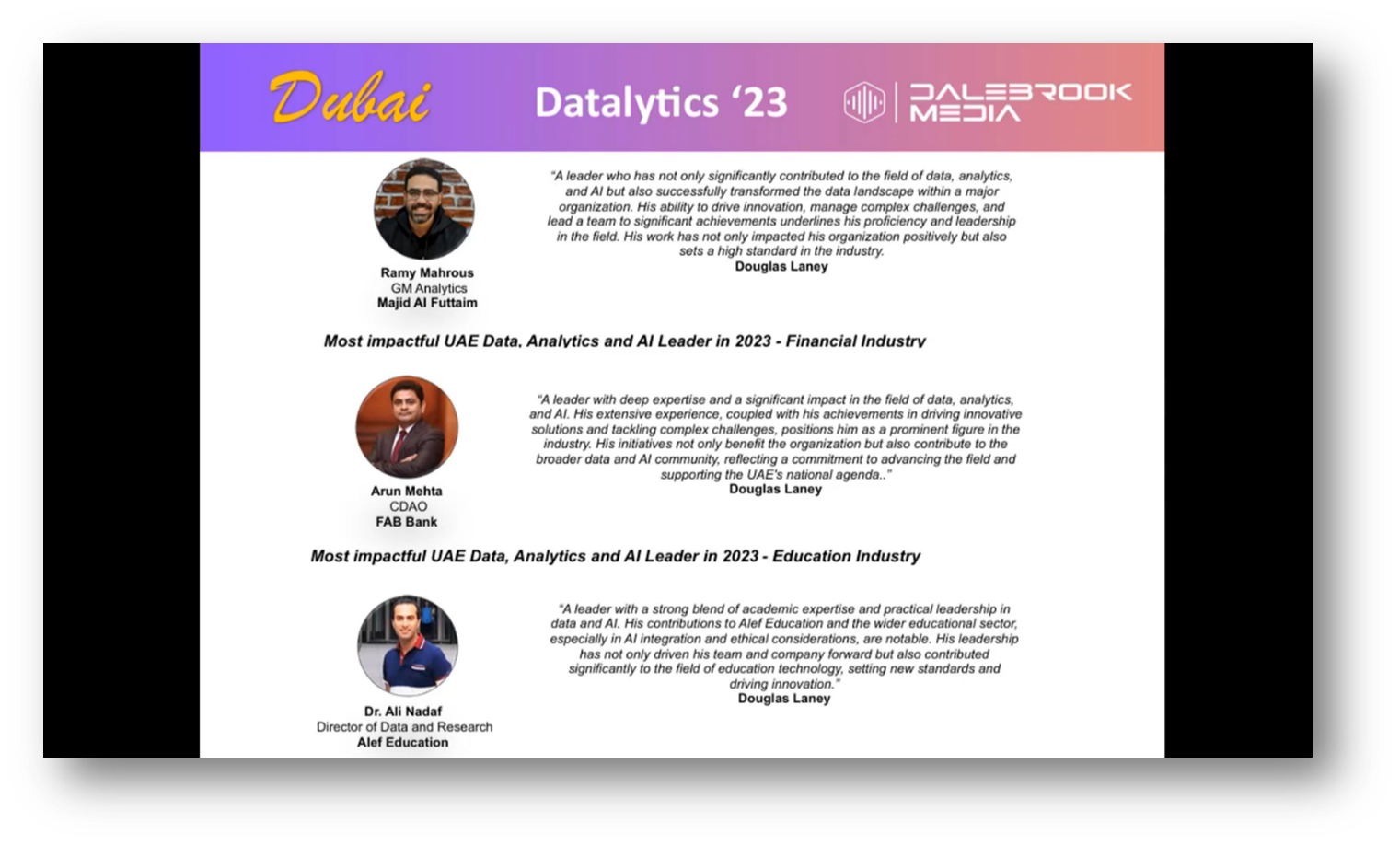 At the recent Datalytics event, a keynote session focused on city sponsorship was well-received, promising an engaging and productive day ahead. Howard will facilitate a session on data and AI maturity, addressing challenges and business use cases with an emphasis on responsible AI. The day will culminate in a group photo and the "Wall of Fame" celebrations, featuring a coffee table book that highlights industry leaders from Datalytics Dubai and Riyadh, complete with their photos and bios.