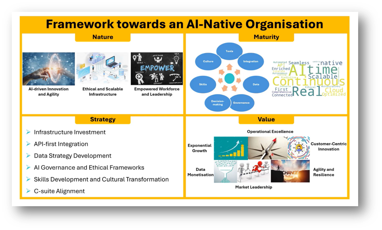 The framework for developing an AI-native organisation emphasises the importance of innovation, agility, and ethical practices within a scalable cloud-based infrastructure. Key components include fostering an empowered workforce and leadership, maturing organisational capabilities, and ensuring alignment within the C-Suite, particularly the CEO’s understanding of AI.