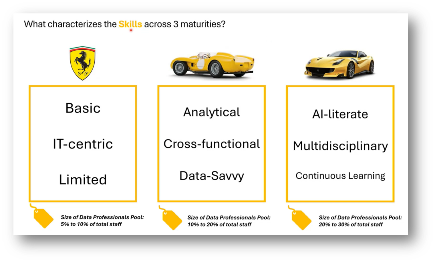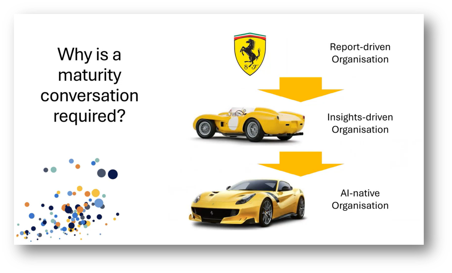 Data is a critical driver of AI progress, emphasising the need for organisations to assess their current maturity state. Similar to seeking therapy, a maturity assessment helps identify where an organization stands, particularly when executives may have an inflated view of their capabilities due to investments in technology.