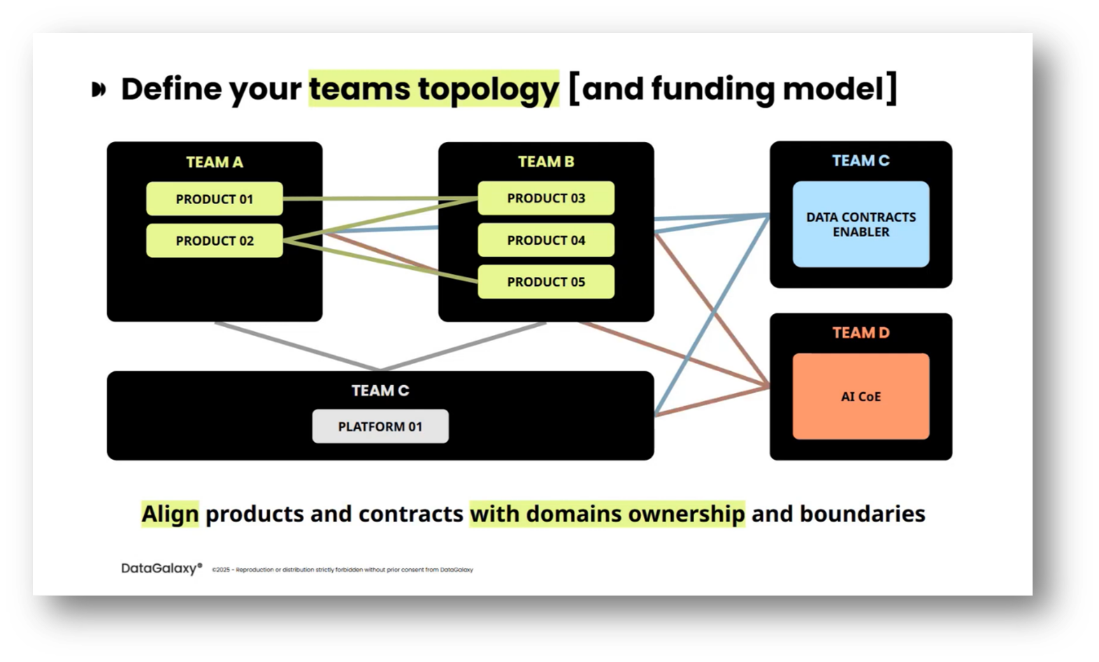 Team topology, a concept outlined in a well-regarded book of the same name, emphasises its importance in establishing effective data practices. Nicolas suggests linking team structure to domain boundaries by assigning different teams to various products, while also considering the need for platform teams that support these product teams. Additionally, enabler teams can be created to standardise data contracts and help integrate emerging capabilities, such as AI, across products.