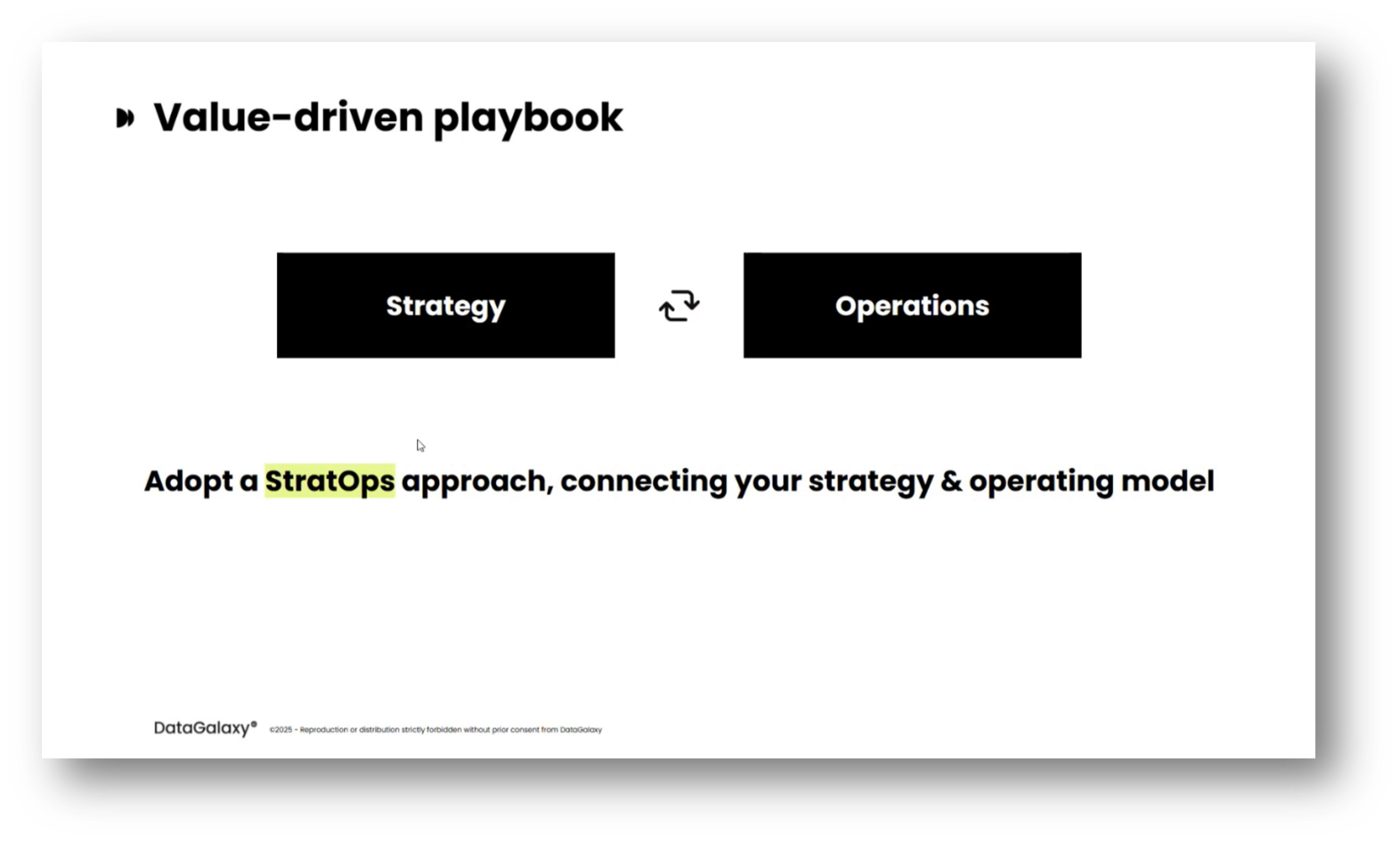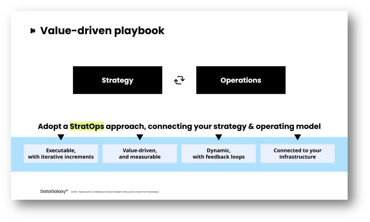 To address the challenges of aligning strategy with operations, we propose a concept called the value-driven playbook, utilising the StratOps (Strategic Operations) approach. This model emphasises the importance of bridging the gap between dynamic strategies, often confined to presentations, and the operational execution that can feel disconnected. Just as DevOps and DataOps integrate development and deployment processes for improved quality and efficiency, StratOps aims to create a seamless connection between strategic vision and operational implementation.