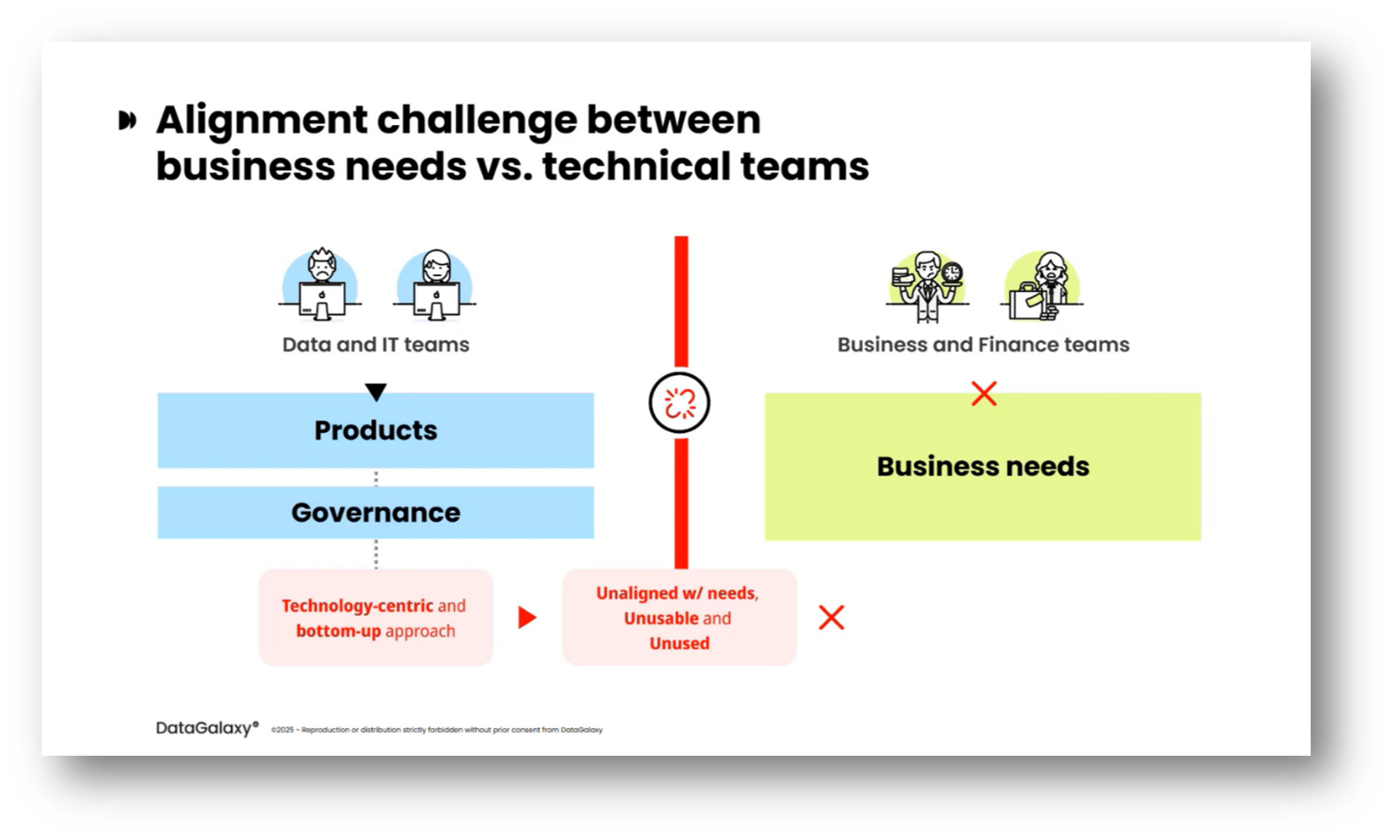 A significant disconnect often exists between data and IT teams and business and finance teams within organisations, leading to challenges in data product adoption. A survey indicated that while 92% of chief data officers believe they deliver value, 92% of IT and business teams disagree, highlighting frustrations over unmet needs and untimely delivery.