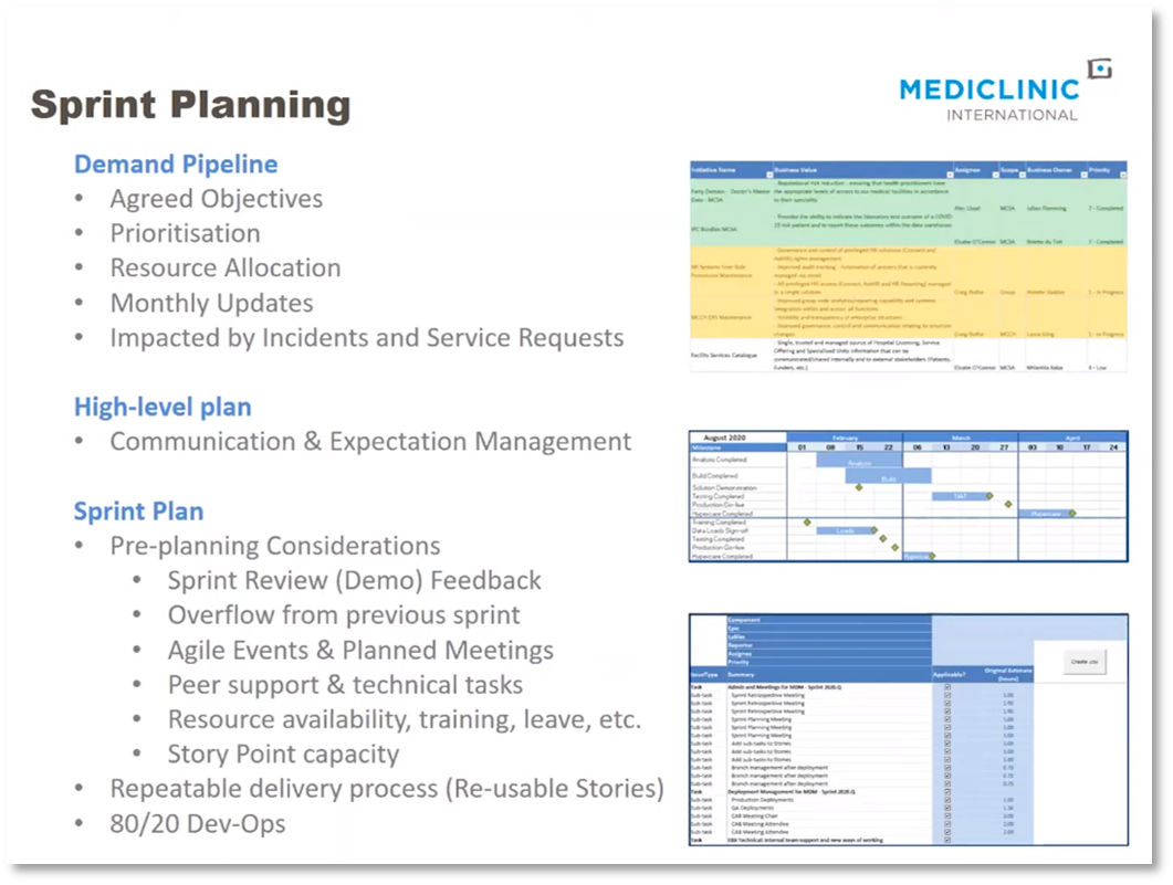 The delivery of functionality to the business is organised into sprints, which are planned using the demand pipeline, high-level plan, and feedback from demos. The sprint plan considers factors such as leave, training, and varying abilities of resources. A draft sprint plan is already in place before the sprint planning meeting, and developers commit to what they can deliver within the sprint. The 80/20 principle is used, only planning 80% of a resource's time to account for unknowns. The process flow of delivering a new solution is documented in a spreadsheet, categorising steps into stories. Incidents or service requests can impact the demand pipeline and high-level plan, requiring engagement with the business to discuss implications.