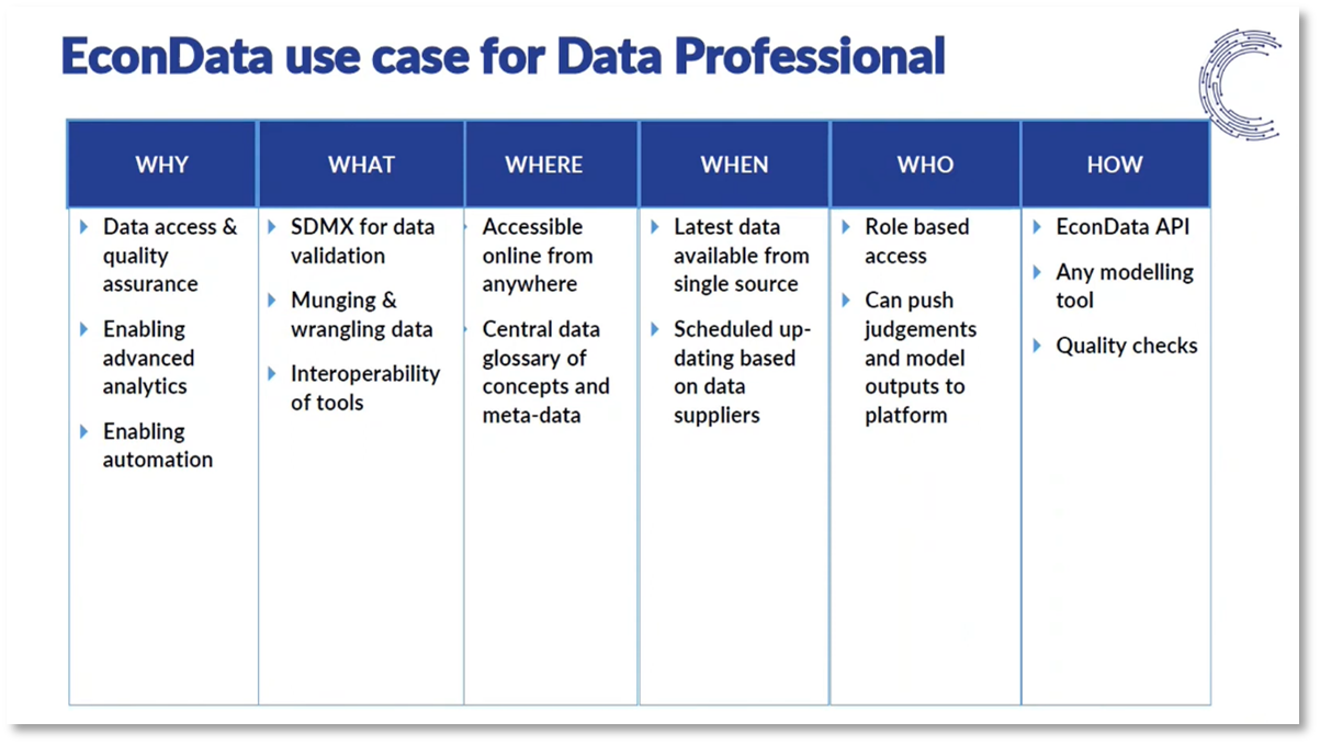 EconData offers an array of data sources and helps ensure data quality. The key value proposition of EconData for data professionals is its ability to generate advanced analytics, enabling automation and eliminating repetitive tasks. The SDMX information model allows for detailed metadata and data lineage cataloguing, enhancing data management and security. It also offers flexible tooling options protection against technological changes and facilitates data democratisation and long-term agility. By adopting the SDMX information model, professionals can leverage existing tools and benefit from the advancements made by the larger community. In terms of governance, it is important to address biases in models to ensure fairness. To summarise, the value proposition of econ data explains the motivation for its use, what users need to know, when and where to use it, and who would benefit from its use.