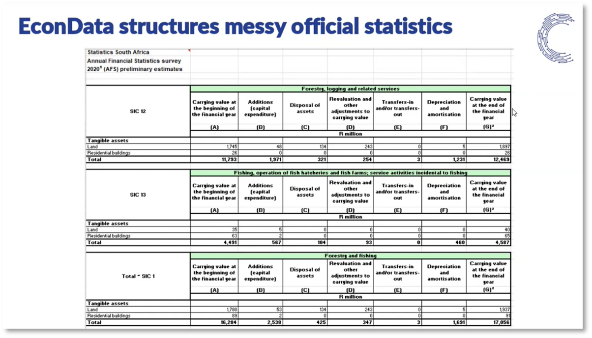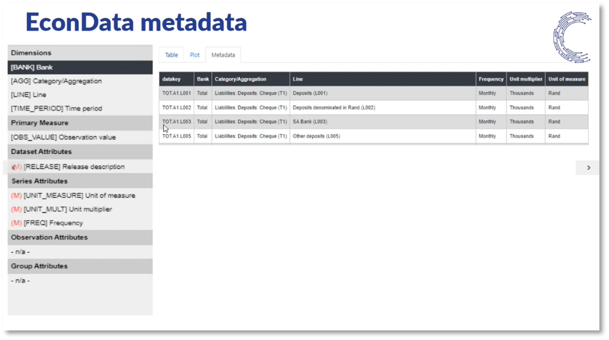 EconData is a reliable source of public domain data in South Africa, providing easy access to time series of individual concepts at the industry level. Its centralised data definitions ensure definitional consistency and enable concept comparison. The data registry includes detailed metadata for each time series, making it easy to download the underlying data in the right format. Additionally, Econ Data applies quality checks to loaded data to ensure its validity. The SDMX structure used by Econ Data provides a codified process for data management. Overall, EconData simplifies accessing and downloading time series data, which would otherwise appear static and difficult to use.