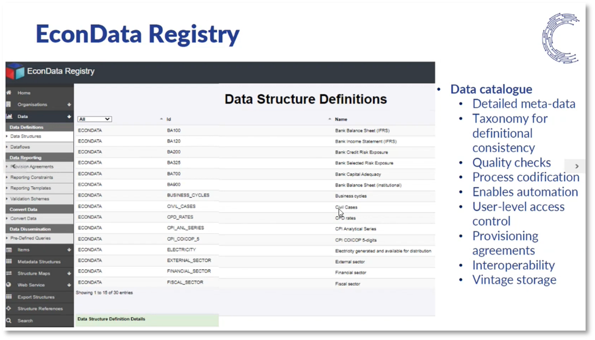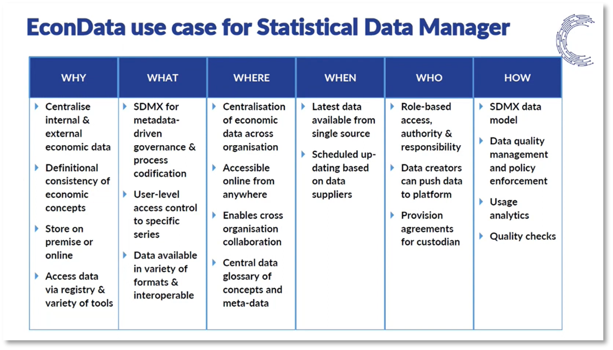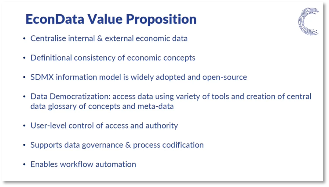 The EconData management system offers centralised economic data with consistent definitions, accessible both on-premise and online. Users can view available data through the registry and interact with it using various tools. By adopting an SDMX work approach, users can enjoy data management, governance benefits, and user-level controls for specific data sets. The system also boasts interoperability benefits and data availability in different formats. Centralising economic data ensures a single source of truth, making it easier to trace processes and ensure governance. The system's availability from anywhere, especially in today's post-COVID world, addresses the challenges faced by large institutions.