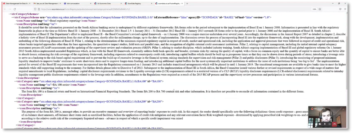 The significance of data as a service lies in its ability to offer various tools for users to access data seamlessly, making it adaptable to various South African economic processes. Econ Data is a platform that provides users with an API to retrieve data and update existing processes programmatically. Users can interact with the data using different tools compatible with SDMX-based data. While searching for time series with similar economic concepts is not currently available in Econ Data, the registry allows users to explore category schemes and statistical subject matter domains by clicking on them. The demonstration provides concrete examples of user interaction and data discovery using the registry. The Basel Regulatory Reporting category scheme, which primarily applies to banking regulations, is described in detail, and different categories within the scheme, such as the BA series, can be viewed. Their linked structures are machine-readable and discoverable programmatically.