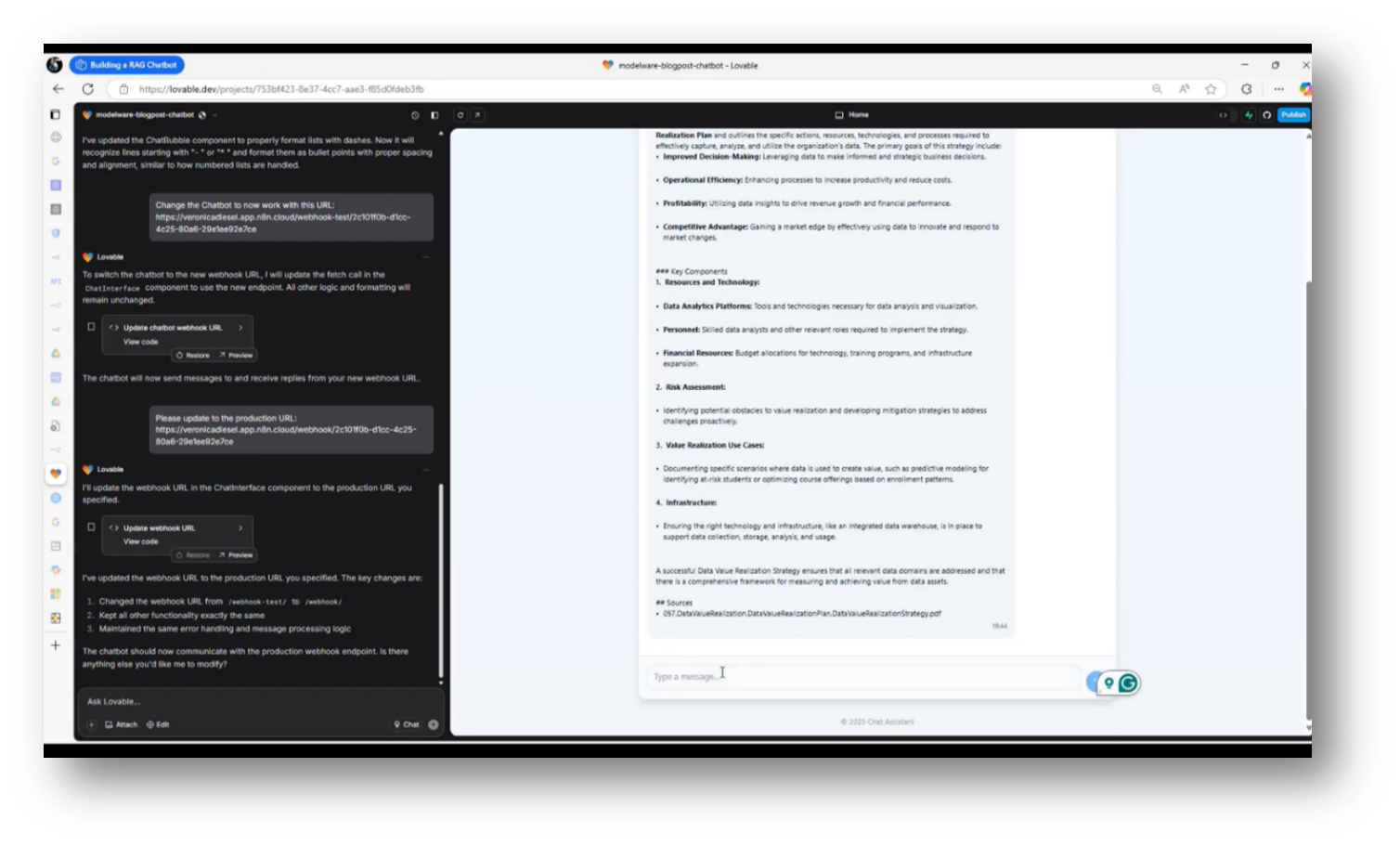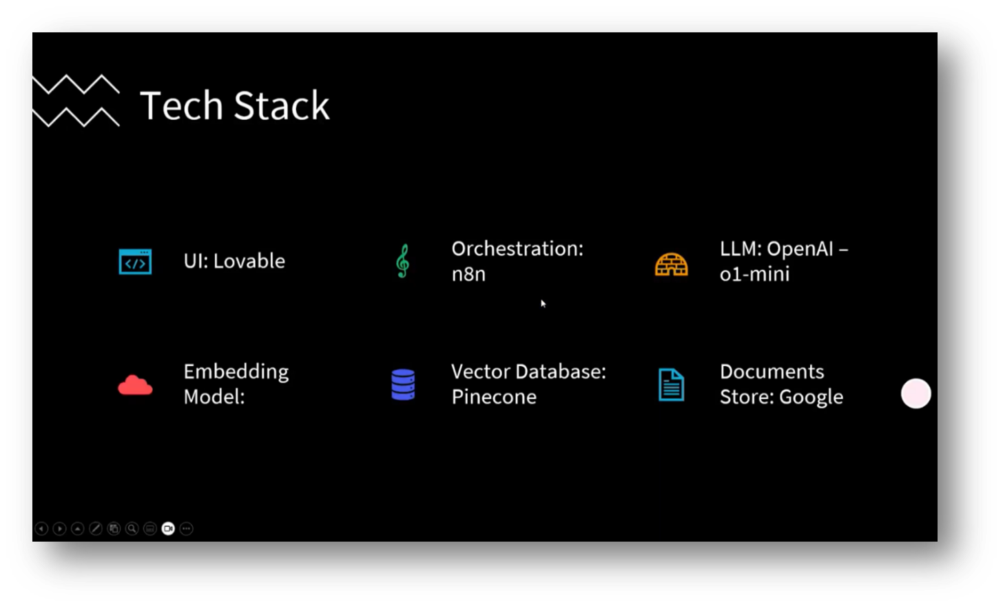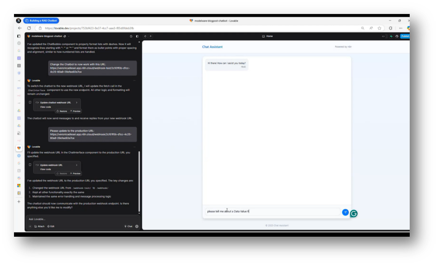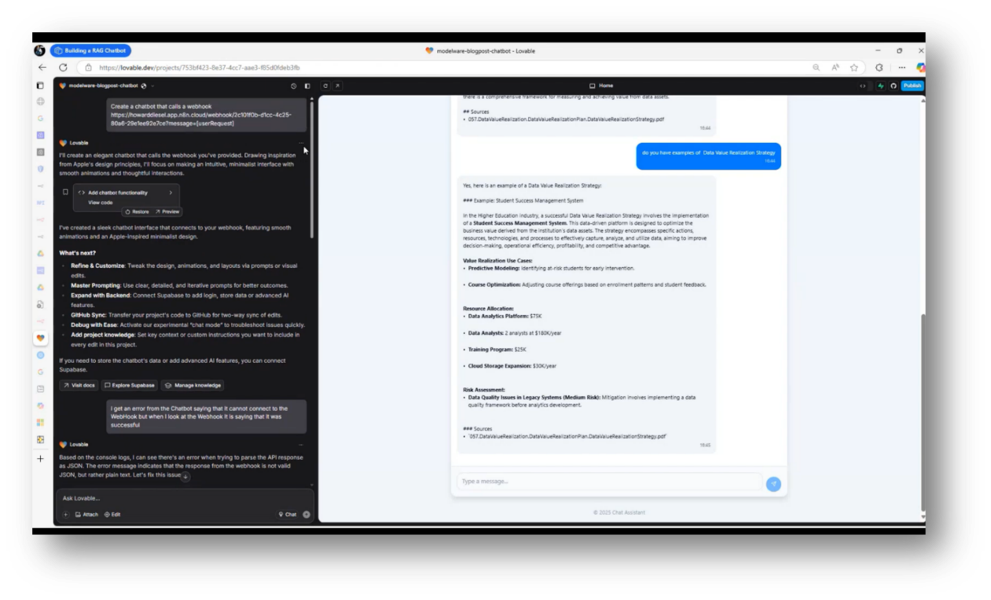 The Chatbot was created using a technology stack that includes Lovable, a platform where users can create their own domains and build websites. While the website-building experience was underwhelming, the chatbot proved to be highly effective. An orchestration engine called n8n facilitates data integration and interoperability, allowing for seamless data movement between the user interface and a vector database.