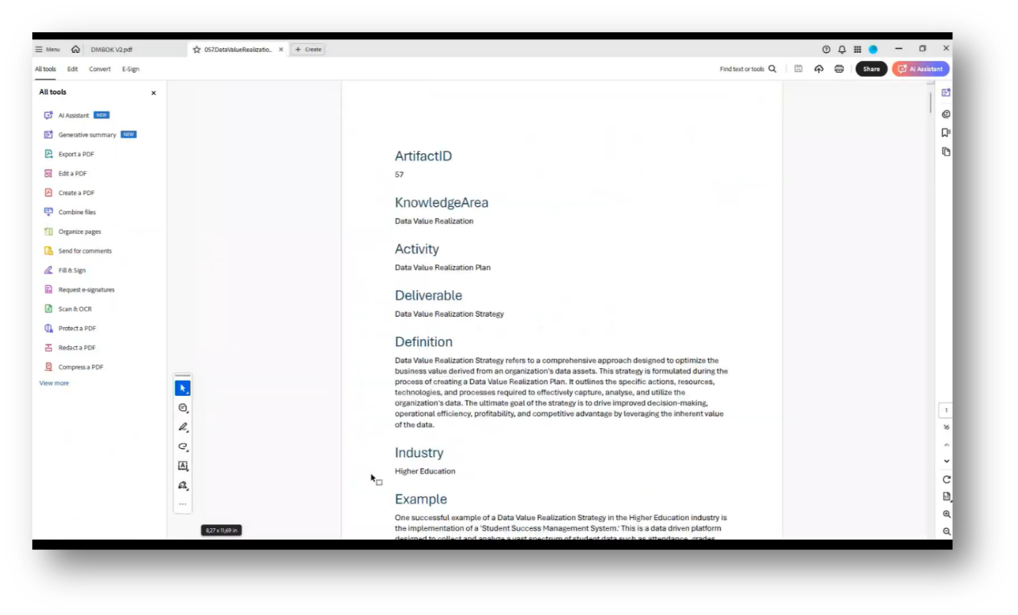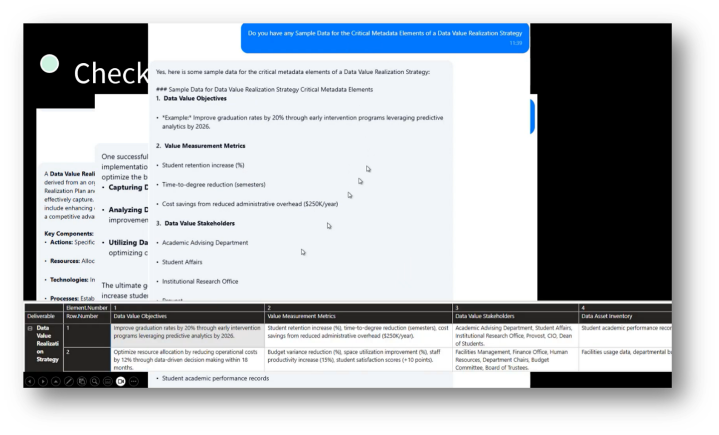 Howard then outlines his project, which focuses on systematically organising data for a Chatbot integration to facilitate user conversations around data strategies in higher education, particularly regarding student success metrics and scorecards. The framework comprises 23 knowledge areas, 183 activities, and 289 deliverables, along with essential Metadata elements for each deliverable, including objectives, metrics, stakeholders, asset inventory, time frames, and governance requirements. Additionally, Howard emphasises the importance of clear explanations of value realisation strategies in Data Management maturity assessments, aiming to provide tangible examples of how to enhance graduation rates and identify key stakeholders within the organisation.