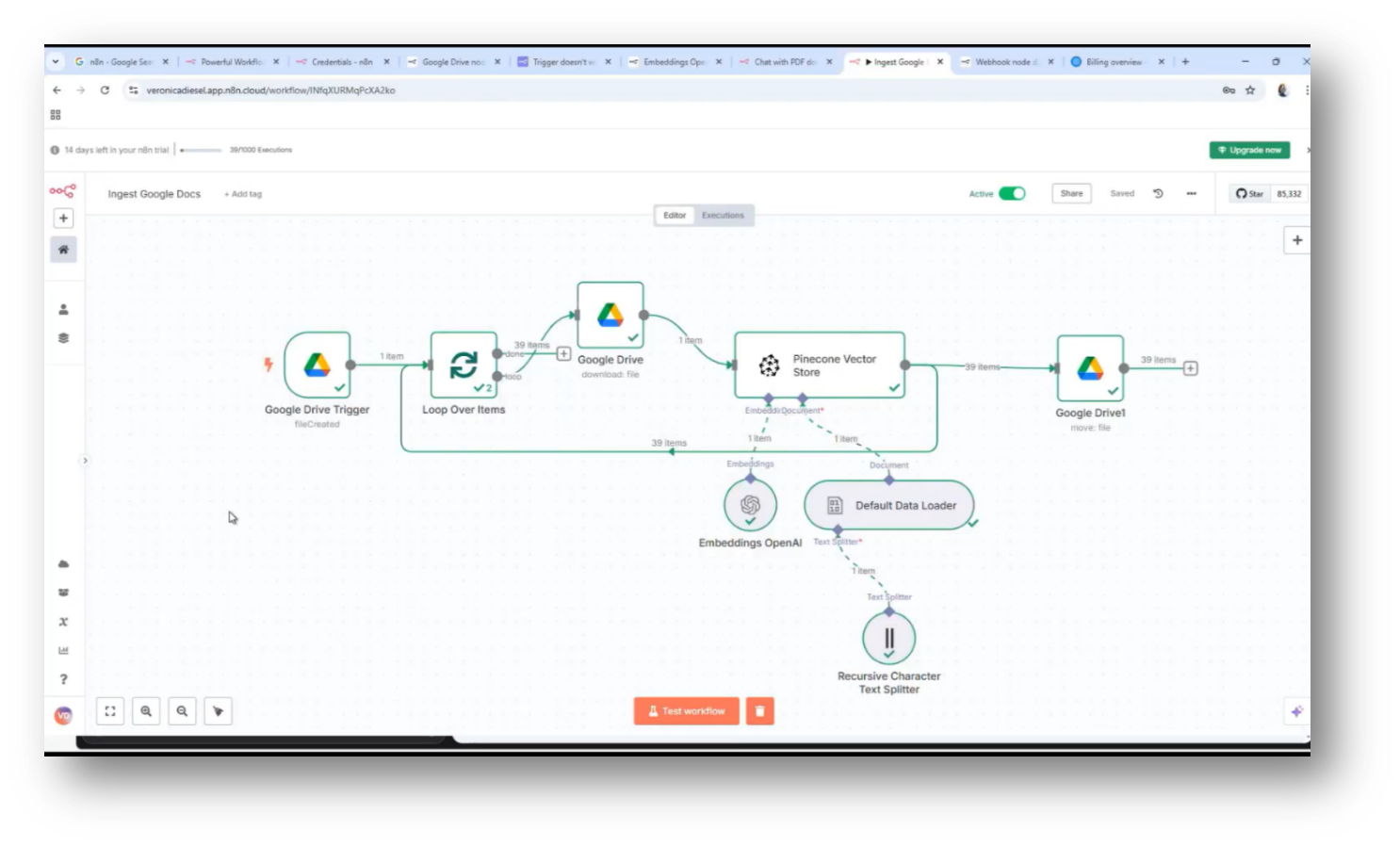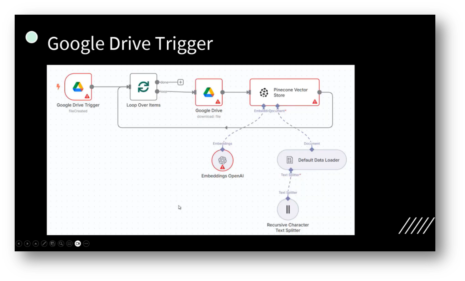This workflow efficiently manages document ingestion while ensuring the integrity of the files in Google Drive. The process concludes with the user expecting the document to soon be removed from the Drive after successful ingestion.