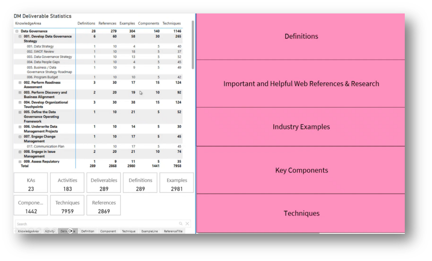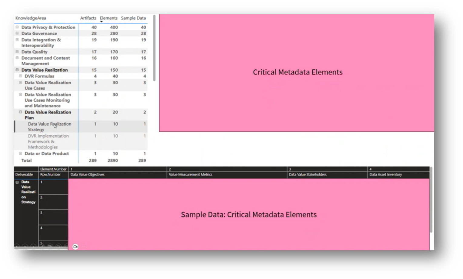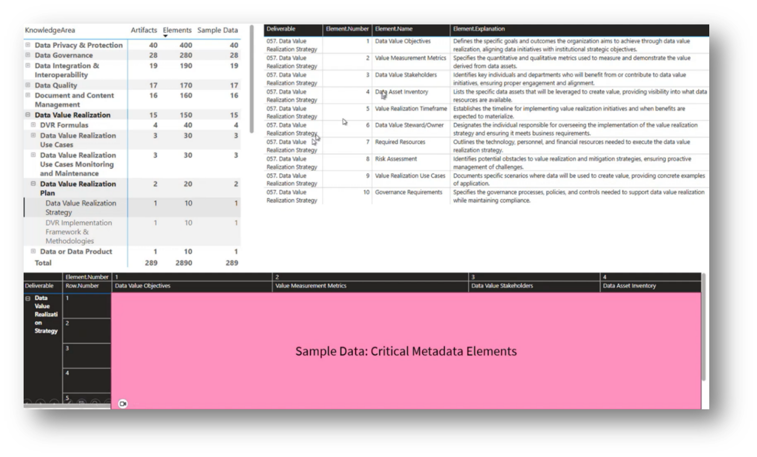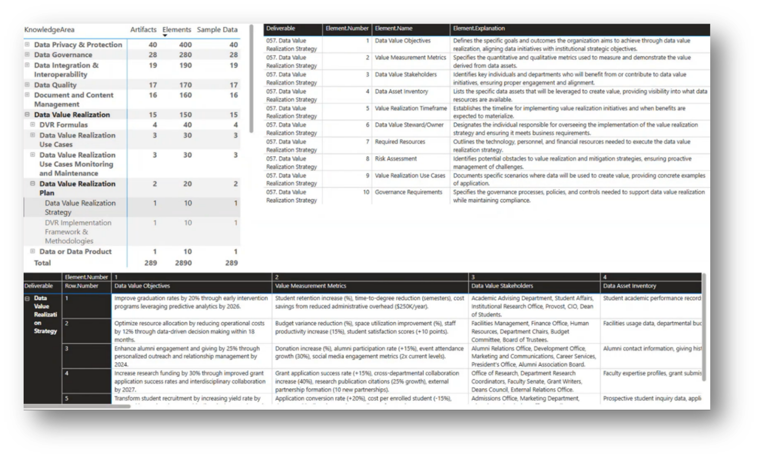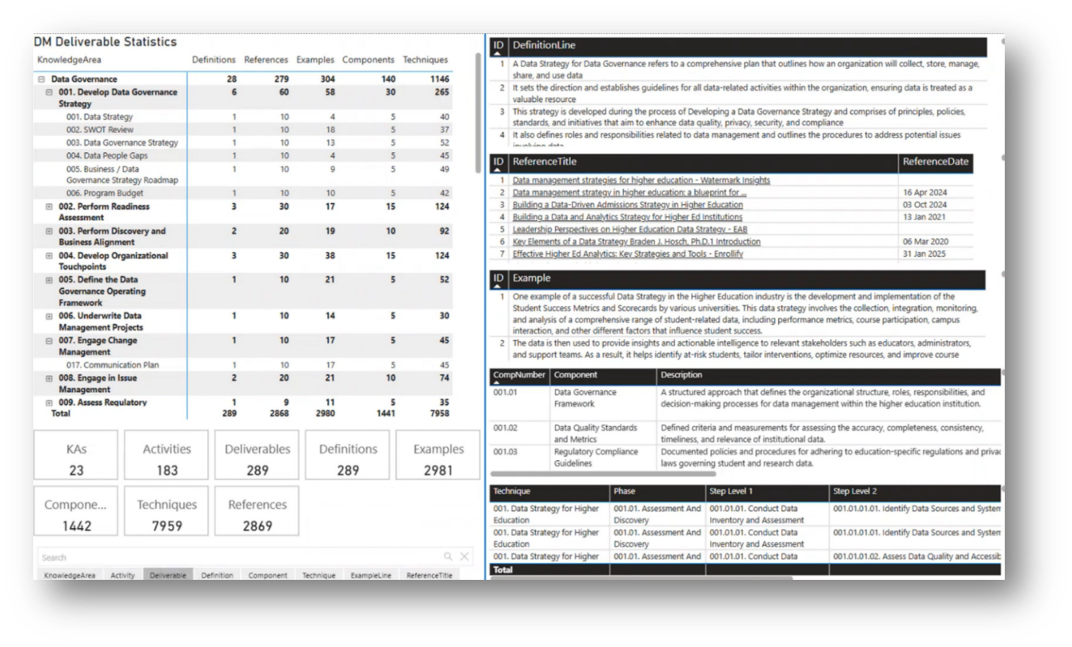 The importance of critical Metadata elements and value metrics in data value realisation is emphasised. Practical resources, including web references for further reading, are provided to enhance understanding. An example involving higher education illustrates entity types, relationships, and attributes used in the Data Modelling process, all of which can be visualised through tools like Power BI to facilitate deliverable analysis and knowledge sharing within organisations.