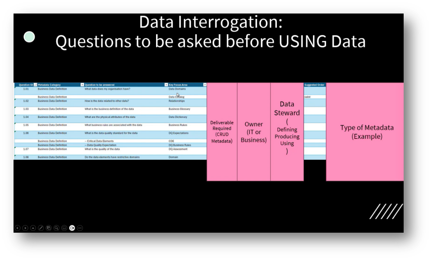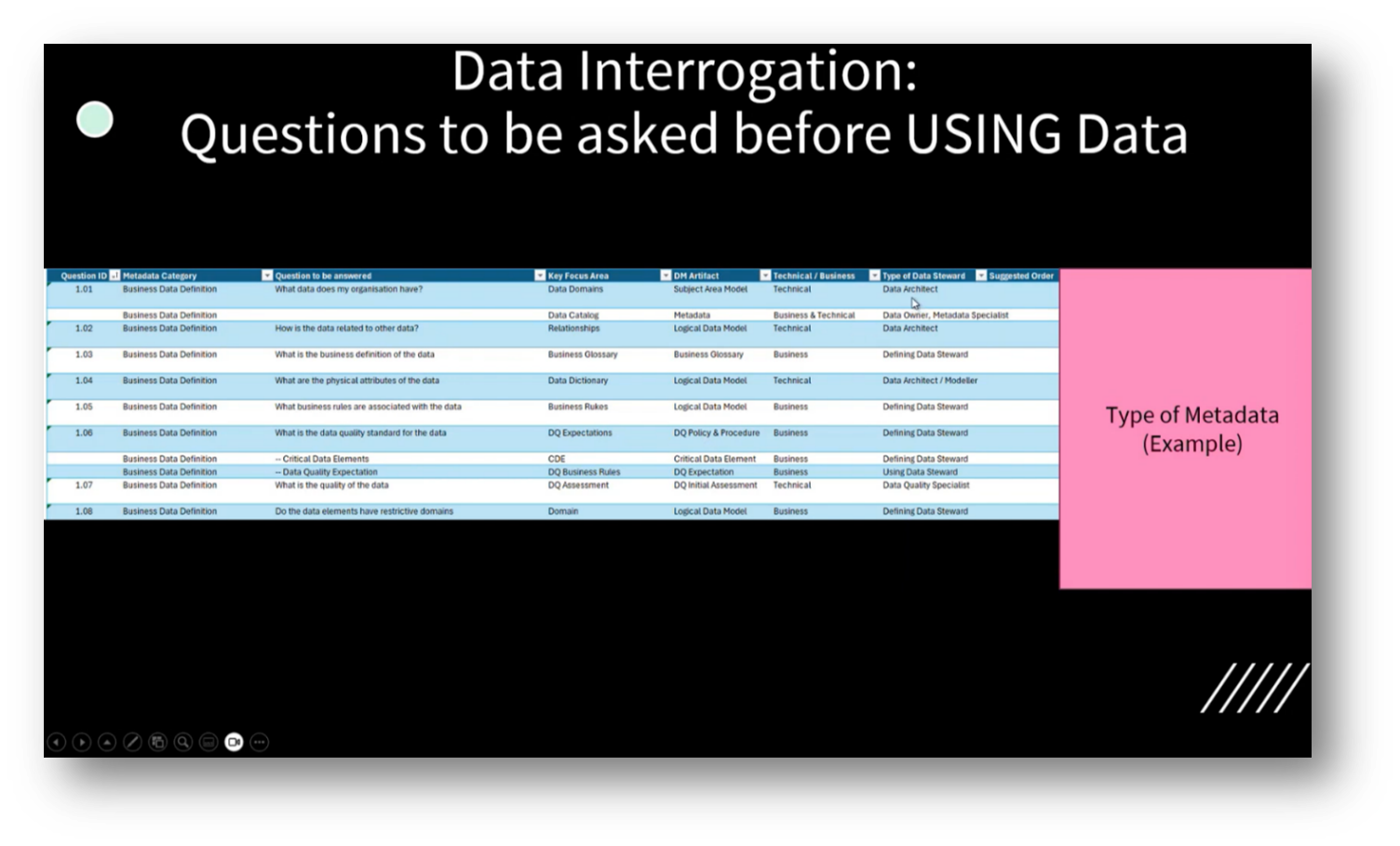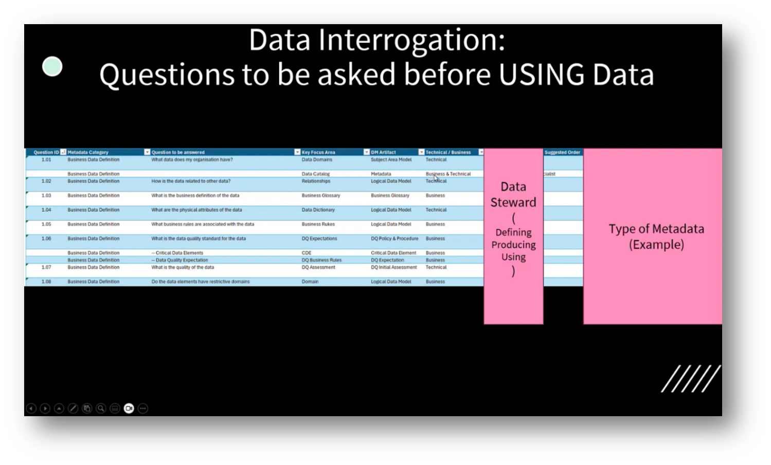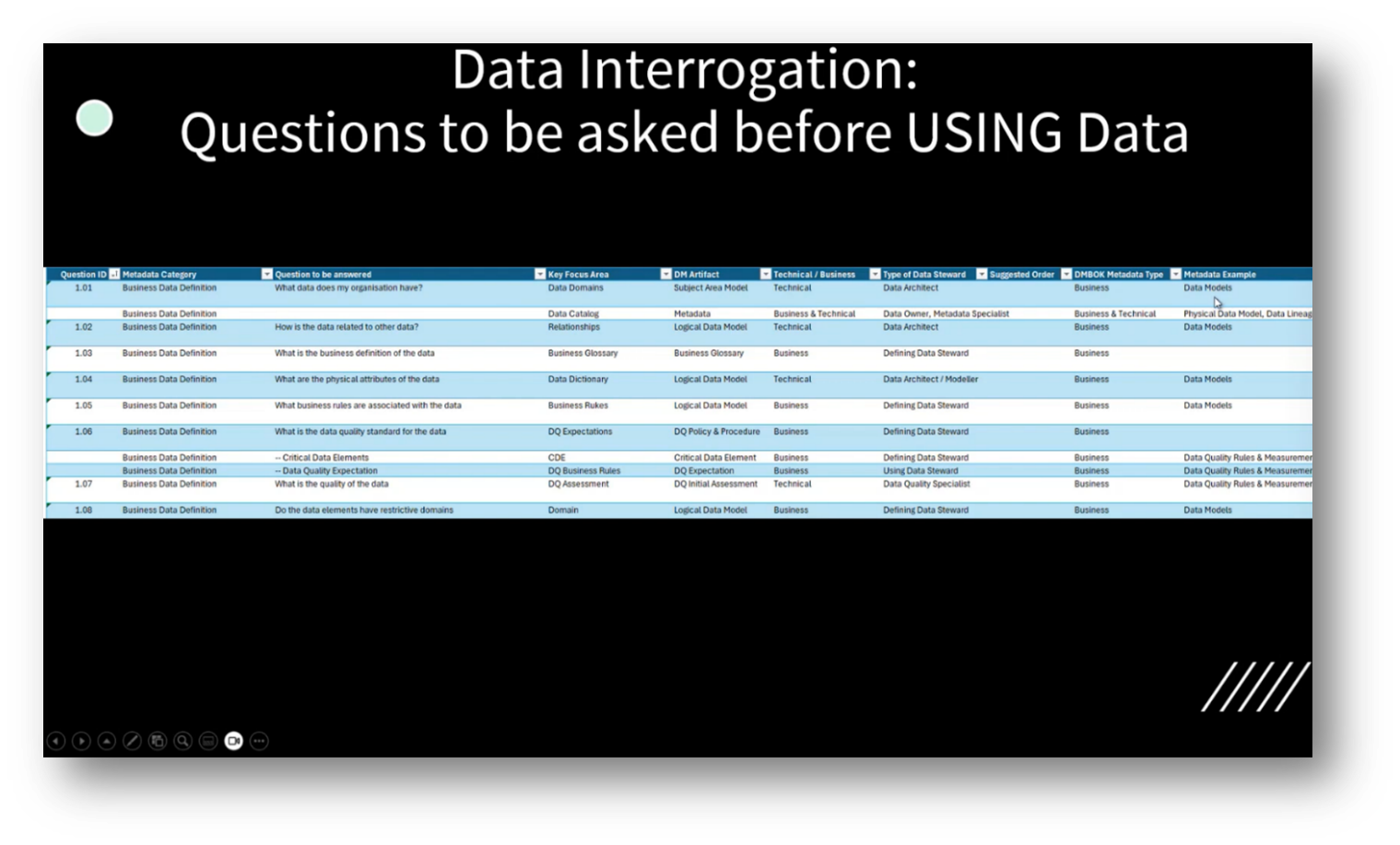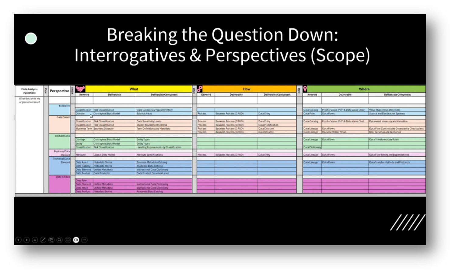 Howard also highlights the importance of narrowing the scope of questions by focusing on specific domains and subject areas, as suggested by participants. Personal experiences were shared, including the development of a Data Catalogue with a top management consulting firm at a central bank. This effort revealed that many employees were unaware of the existing data, leading to feelings of wasted effort and confusion about unmet data needs. This raised questions with the attendees about the necessity of certain data and the strategies required to fulfil those needs effectively.