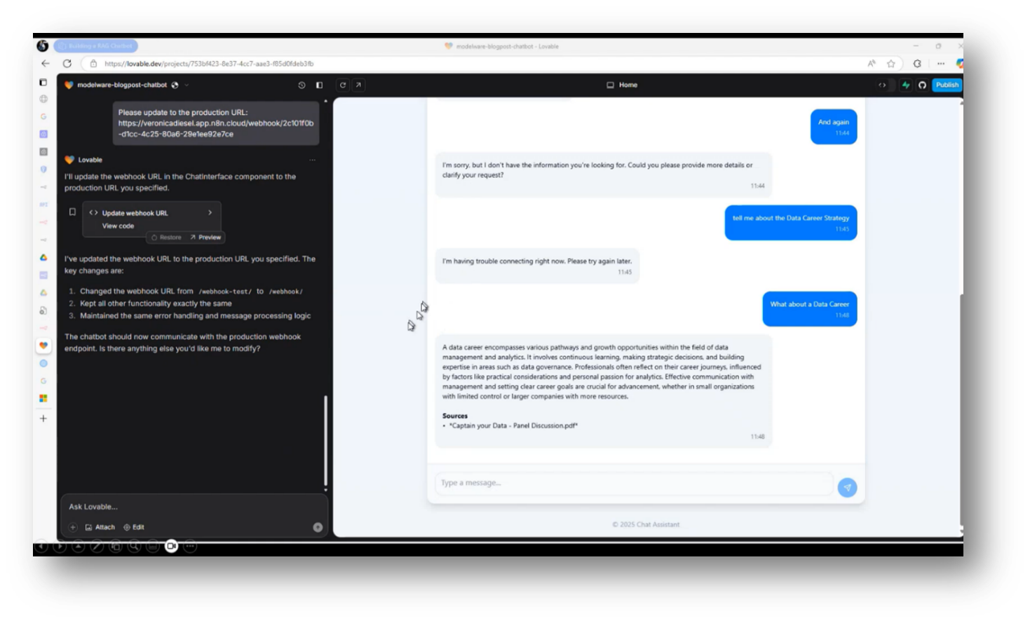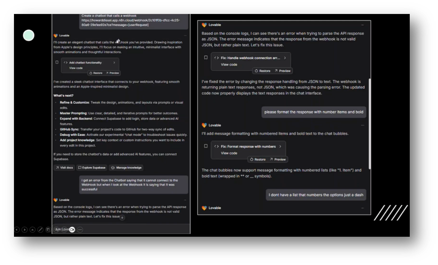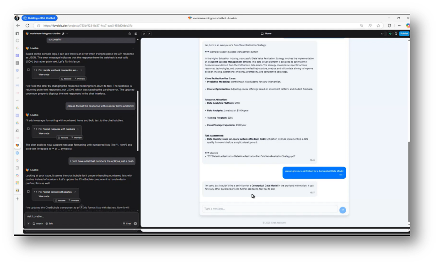 The process of building a chatbot involved simply asking it to create the code, which it successfully provided, followed by debugging assistance when issues arose. Howard specifically instructed the Chatbot to format responses with numbered items and in bold, enhancing clarity and usability. He also integrated the webinars into a searchable database, where users can ask questions about topics such as data careers and receive direct responses.