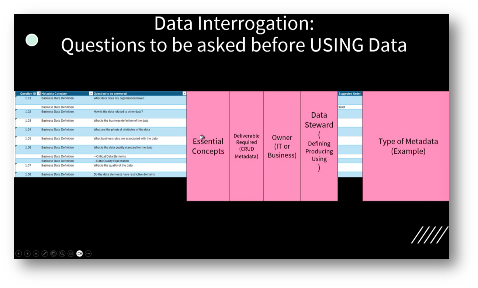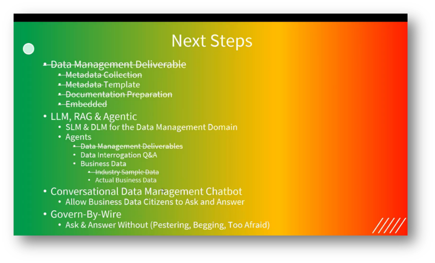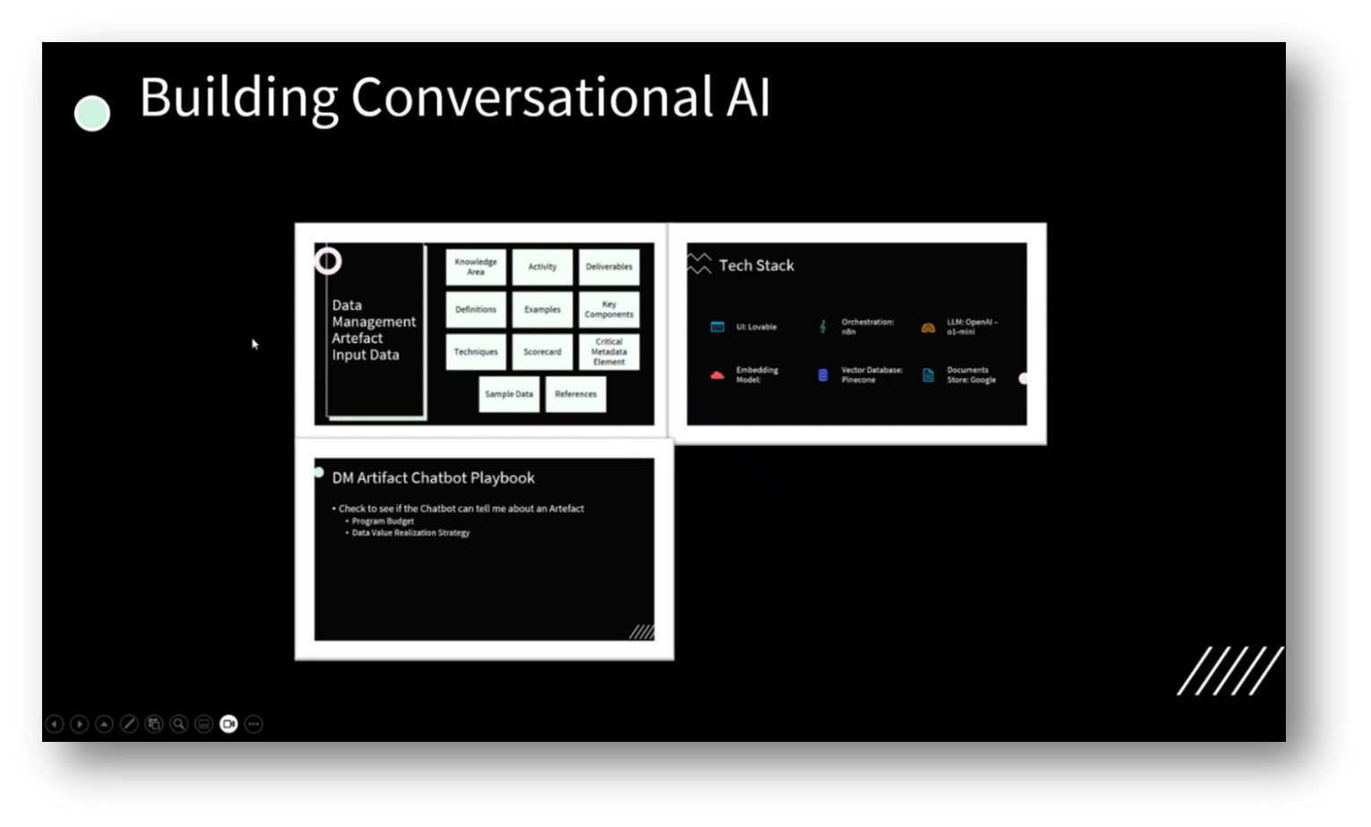 This webinar outlines a comprehensive approach to building a conversational AI chatbot tailored for data interrogation and Metadata analysis, integrating CDMP Data Management principles. Howard Diesel addresses key challenges in navigating diverse business terminologies and cultures, while emphasising the importance of Data Governance and value recognition strategies. The proposed chatbot will leverage a robust technology stack, including a vector database integrated with Google Drive and AI capabilities, to enhance Data Management artefacts and streamline document management processes.