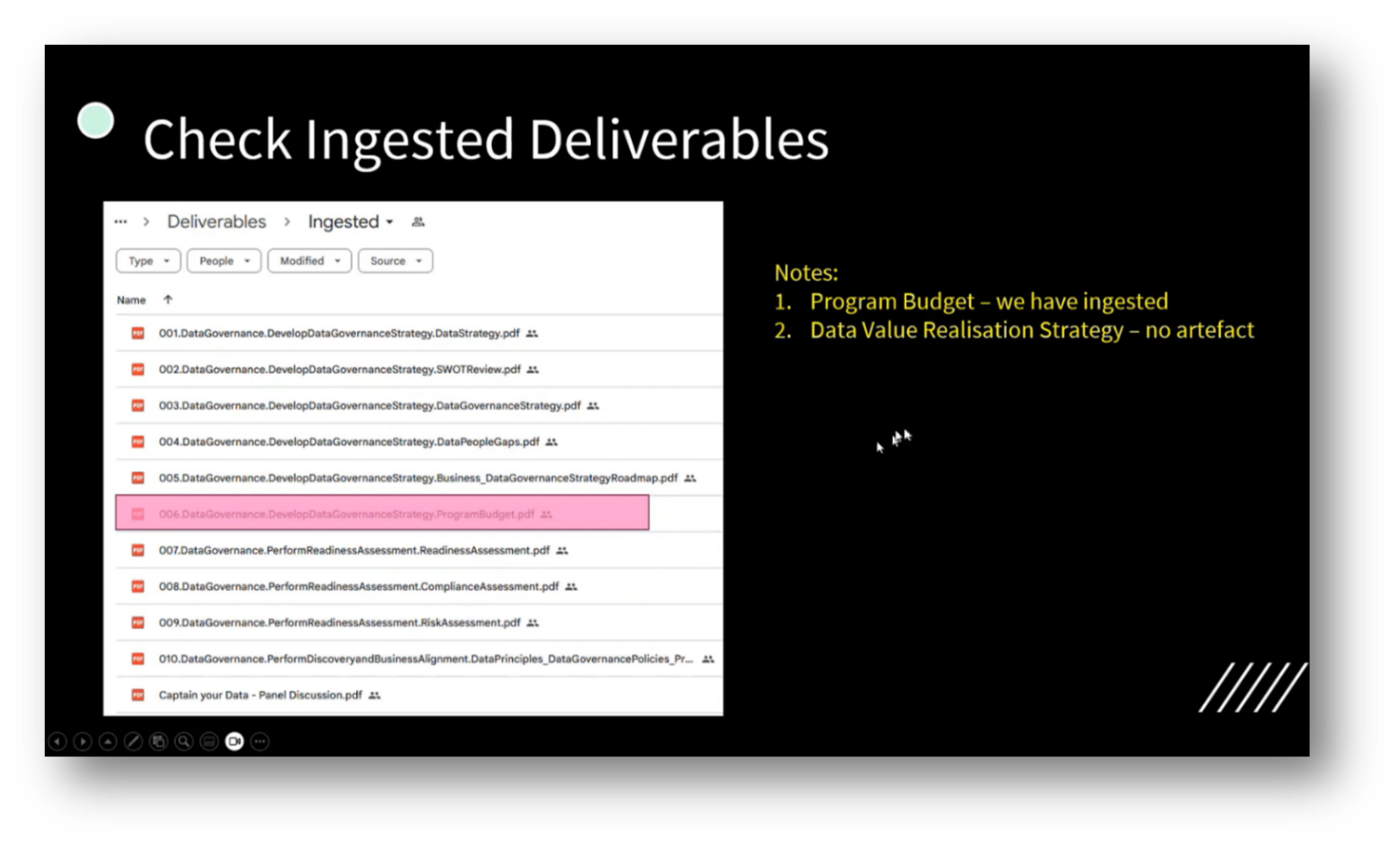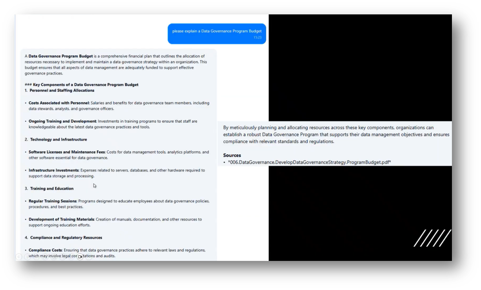 Managing a governance program budget revolves around the related processes for data value realisation. Howard then highlights their experience in checking deliverables and confirming the existence of a program budget, noting the absence of a value realisation artefact. He utilises a Chatbot to gather information on data value realisation strategies, with insights linked to Power BI, which effectively displays metrics such as improved graduation rates and student retention.