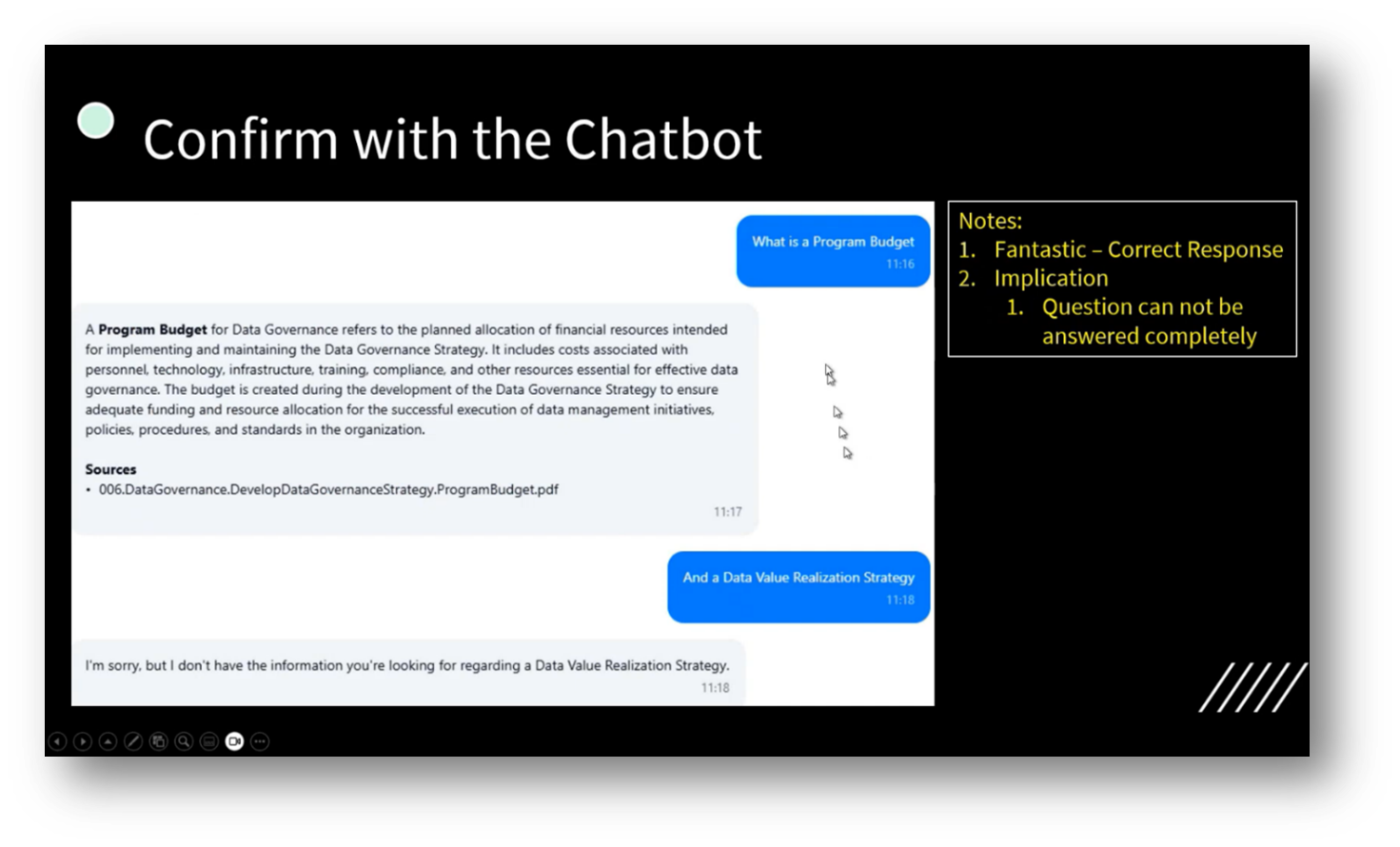 Howard highlights the importance of understanding the temporal aspects of data, particularly in relation to when a document was created and any associated latency. He raises the question of whether answers to inquiries remain valid if the original document is deleted from the vector database, emphasising that while the definition of a conceptual data model remains unchanged, the direct linkage to a document may be lost. Additionally, an attendee mentions a strategy in the Chatbot design to avoid sourcing answers from the internet unless explicitly provided, reinforcing the need for a strong internal knowledge base, including Data Governance, and the potential for extending chatbot functionality to include web-sourced examples when necessary.