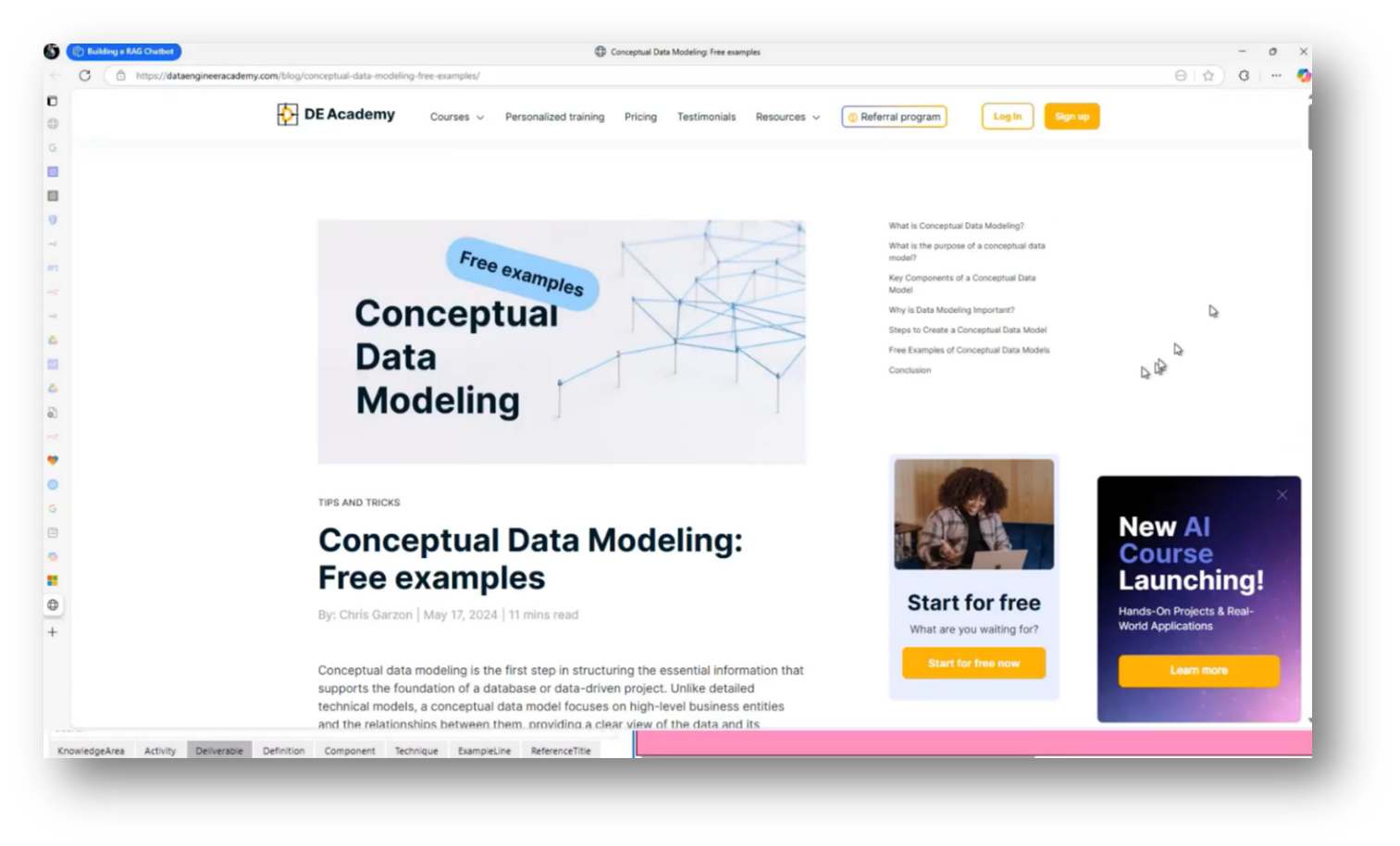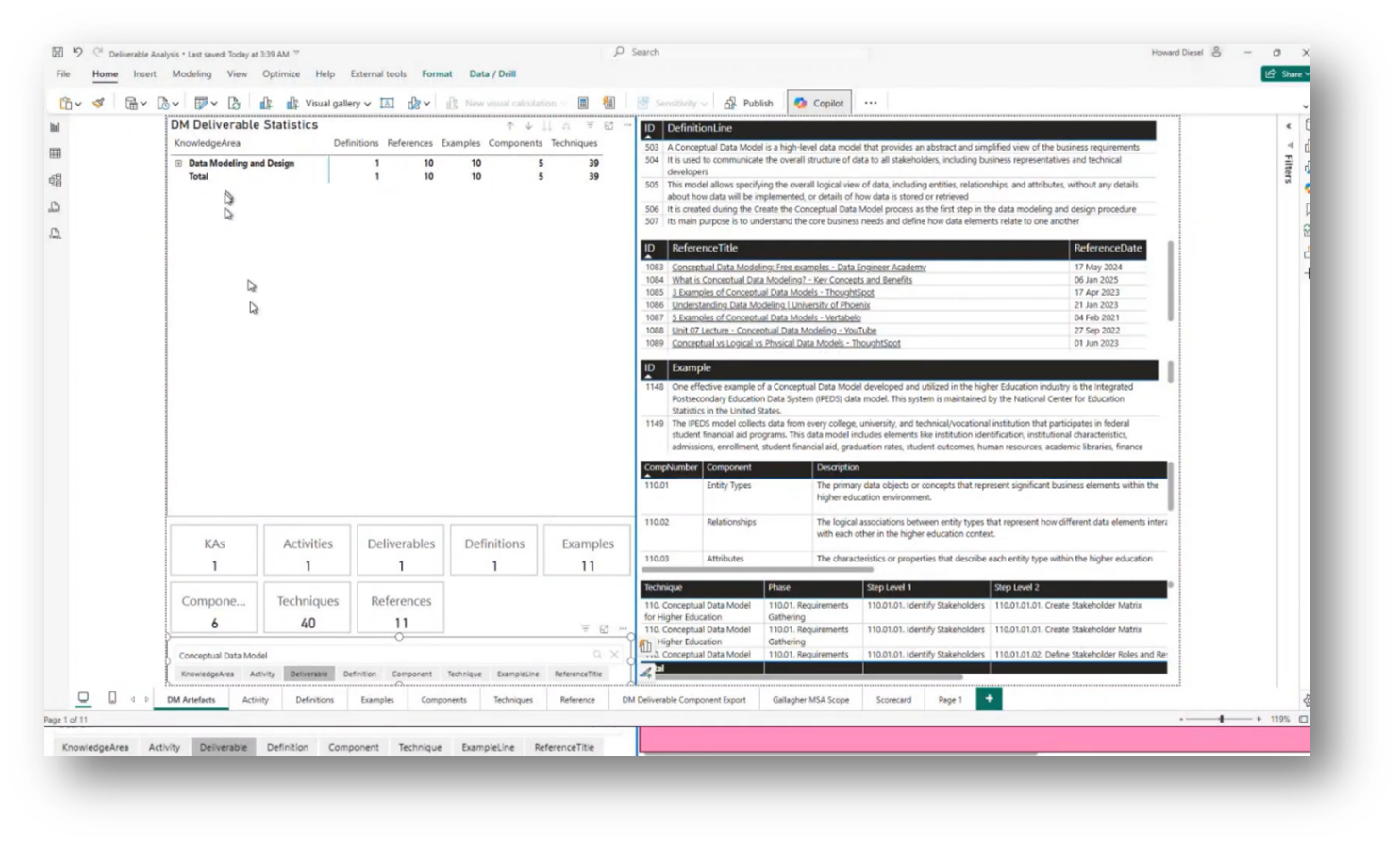 Howard outlines the essential aspects of building a Data Management artefact, focusing on core knowledge areas, activities for creating deliverables, and their definitions. For instance, a conceptual data model consists of key components such as entities, relationships, and constraints. Techniques for building these models and criteria for their evaluation—whether they are deemed good or bad—are also critical.