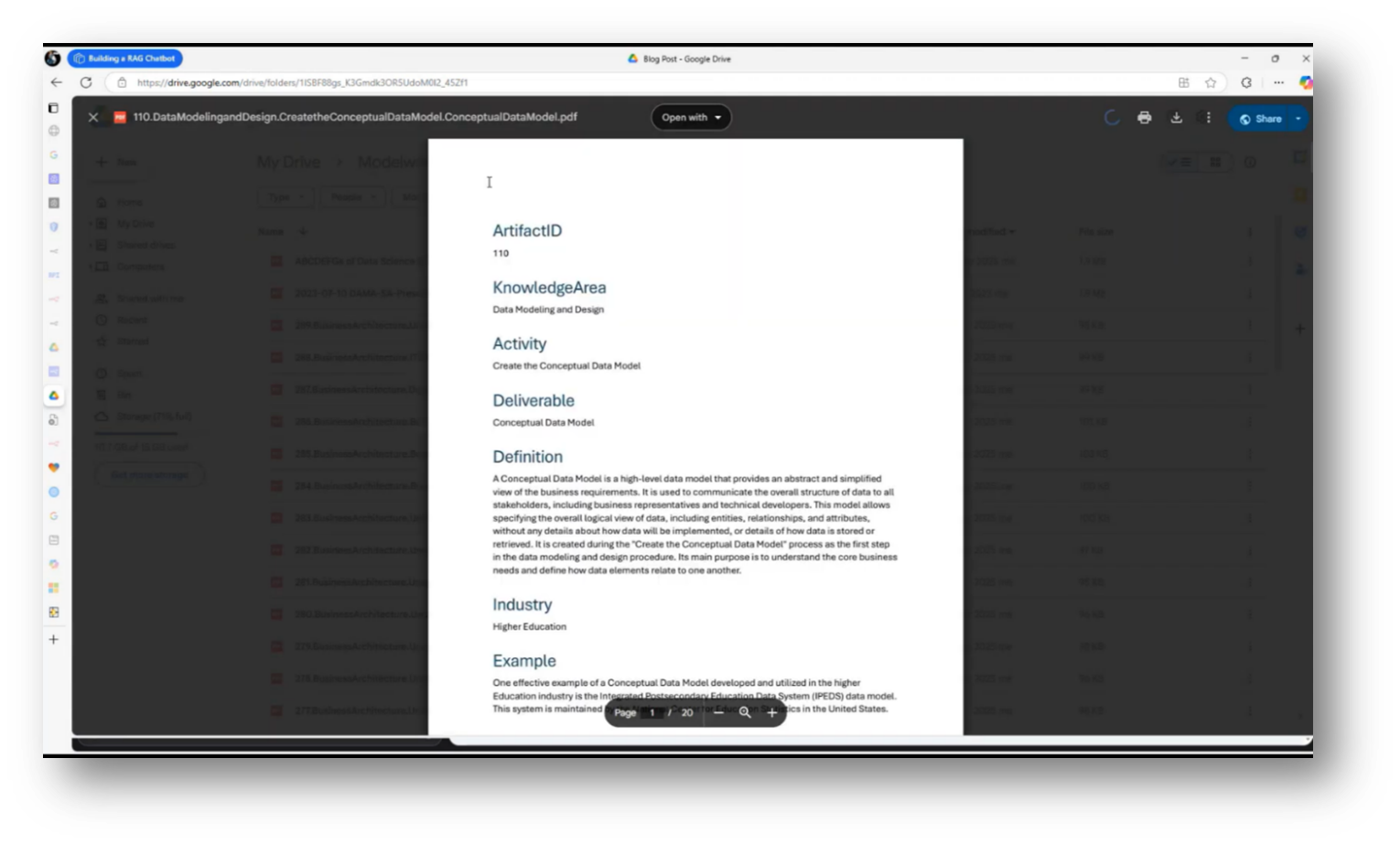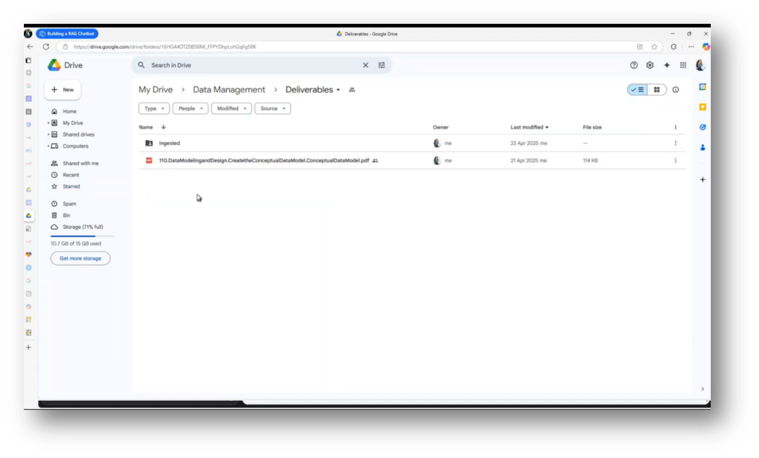 In his demonstration of the Chat Assistant, Howard navigated to his Google Drive to locate a document related to a conceptual data model. After finding the document, he moved it to an ingestion platform for processing. Howard then initiated an ingestion routine, which involves downloading the file, creating necessary embeddings, and relocating the file to a designated directory to prevent duplicate processing.