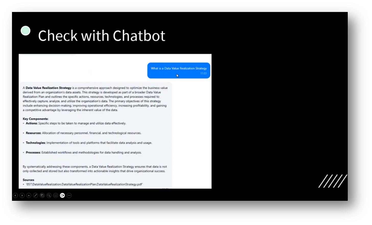 Howard highlights a no-code solution for building a Chatbot, emphasising the ease of creating user-friendly interfaces without programming skills. The focus is on providing ontology, structure, and examples to help users collect and understand relevant information efficiently. The Chatbot is designed to simplify access to Data Governance terminology and related concepts, enabling users to quickly retrieve definitions and examples, such as a "data value realisation strategy." By integrating various artefacts and documents, the chatbot enhances the user experience, making information more accessible than traditional methods, such as SharePoint sites. Overall, the goal is to streamline information retrieval and improve understanding of complex data-related strategies.