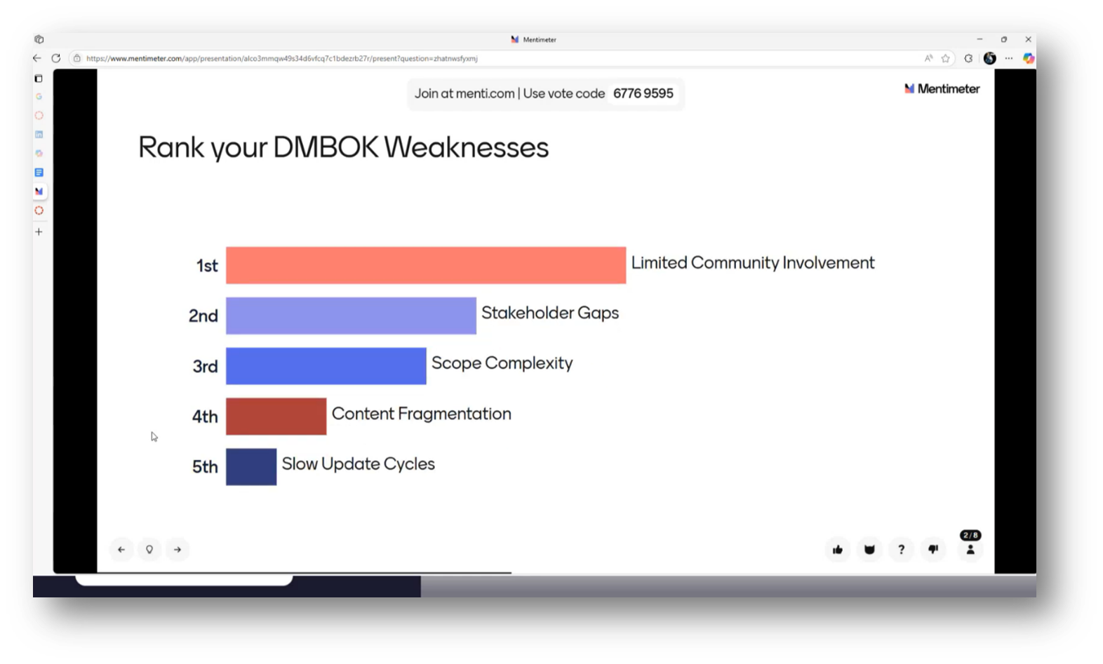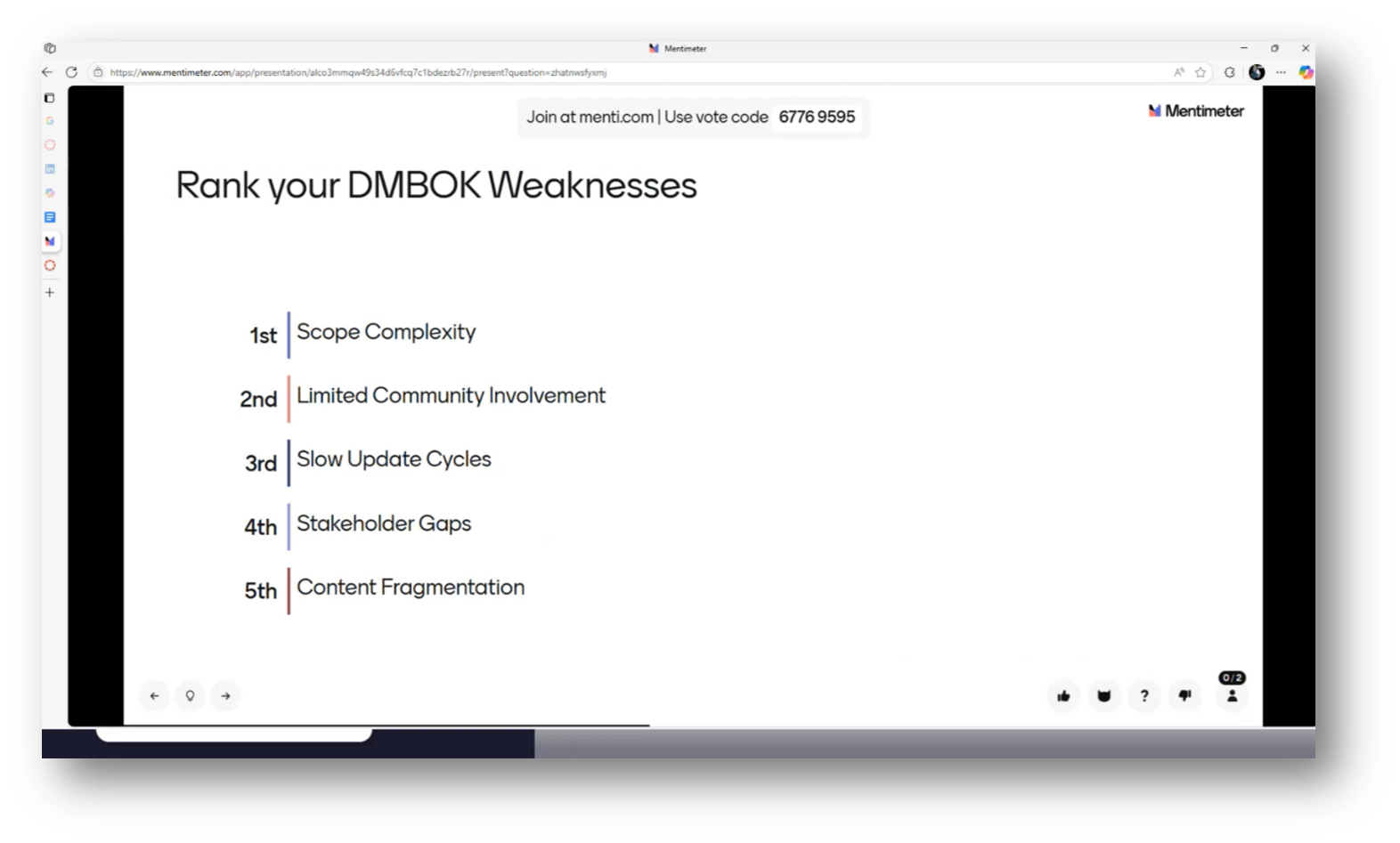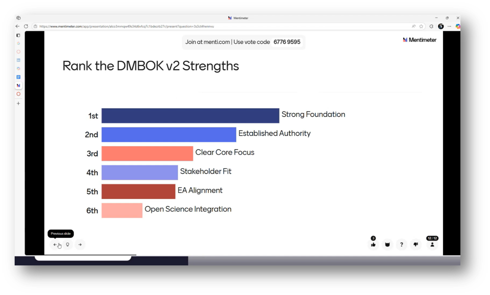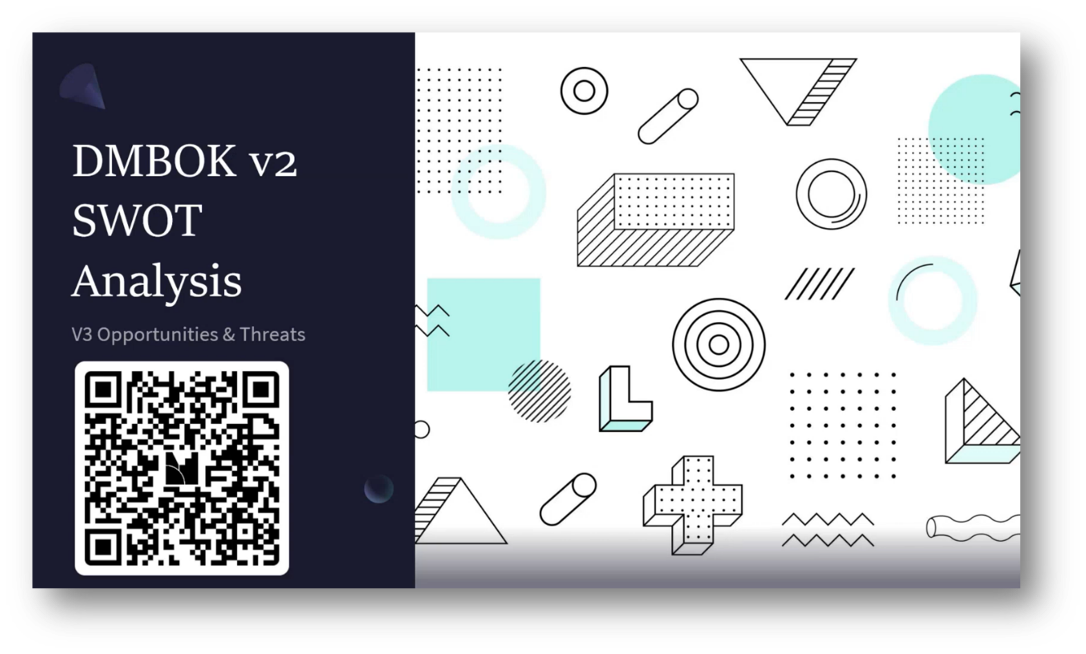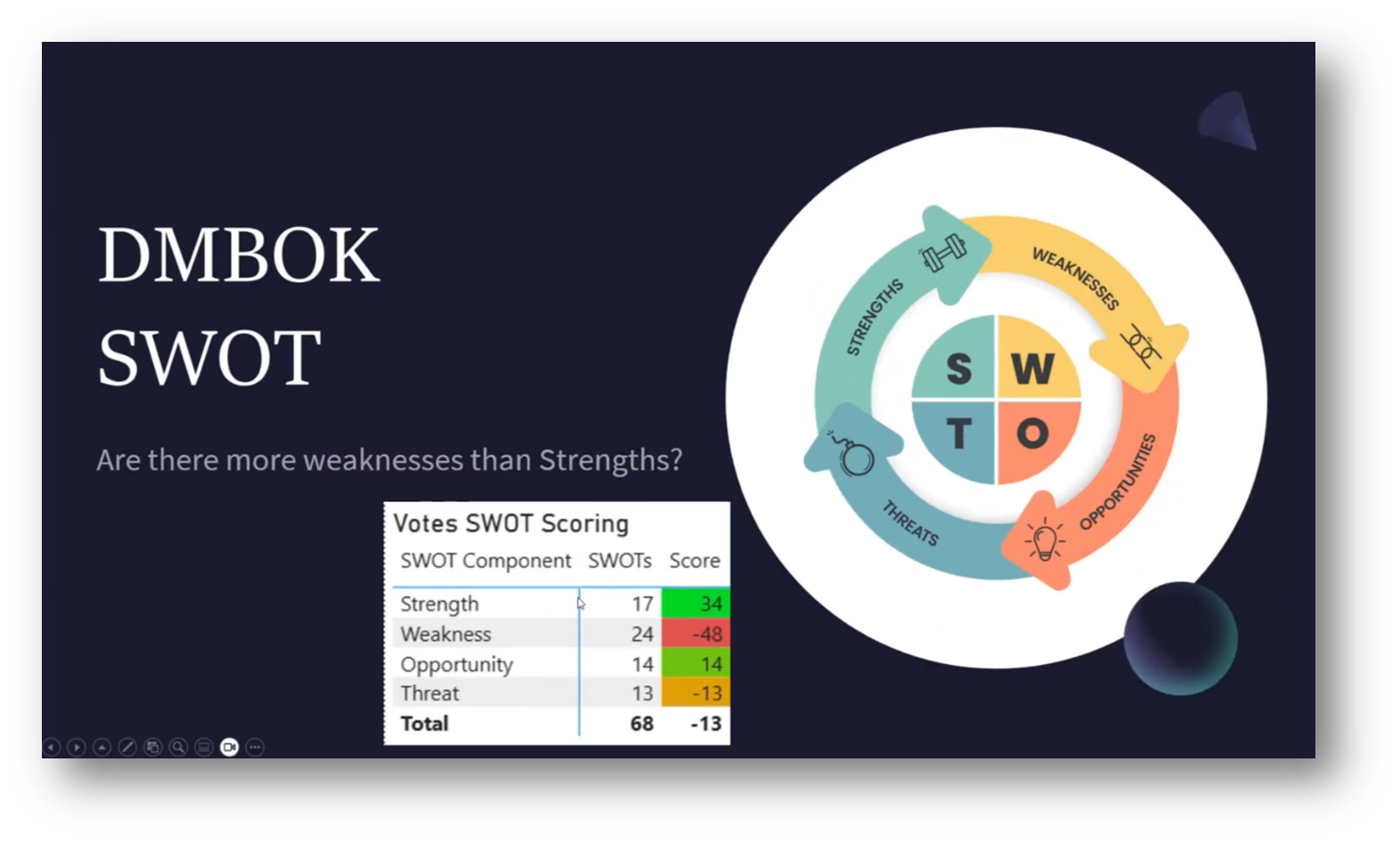 Howard Diesel opened the webinar with the focus of continuing the review of the DMBoK versions two and three. He thanked the attendees for the valuable feedback and support in identifying areas missing from the main team slides. Additionally, he included a ranking of standardised strengths, weaknesses, opportunities, and threats (SWOT), and requested participation in a mentee quiz to gather additional rankings.