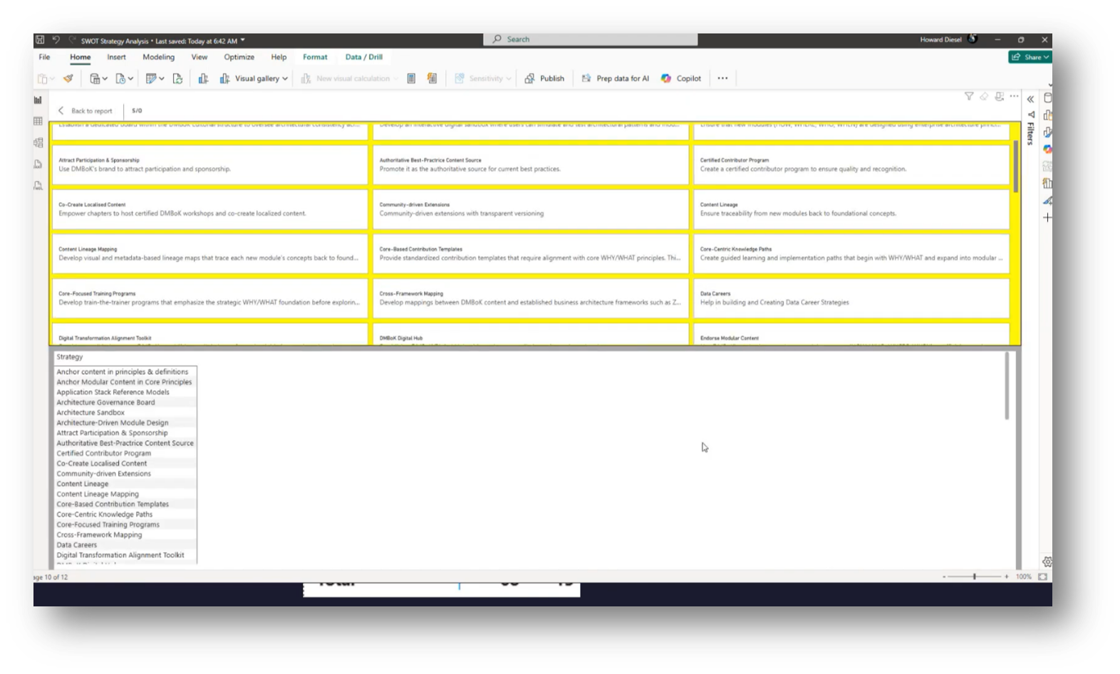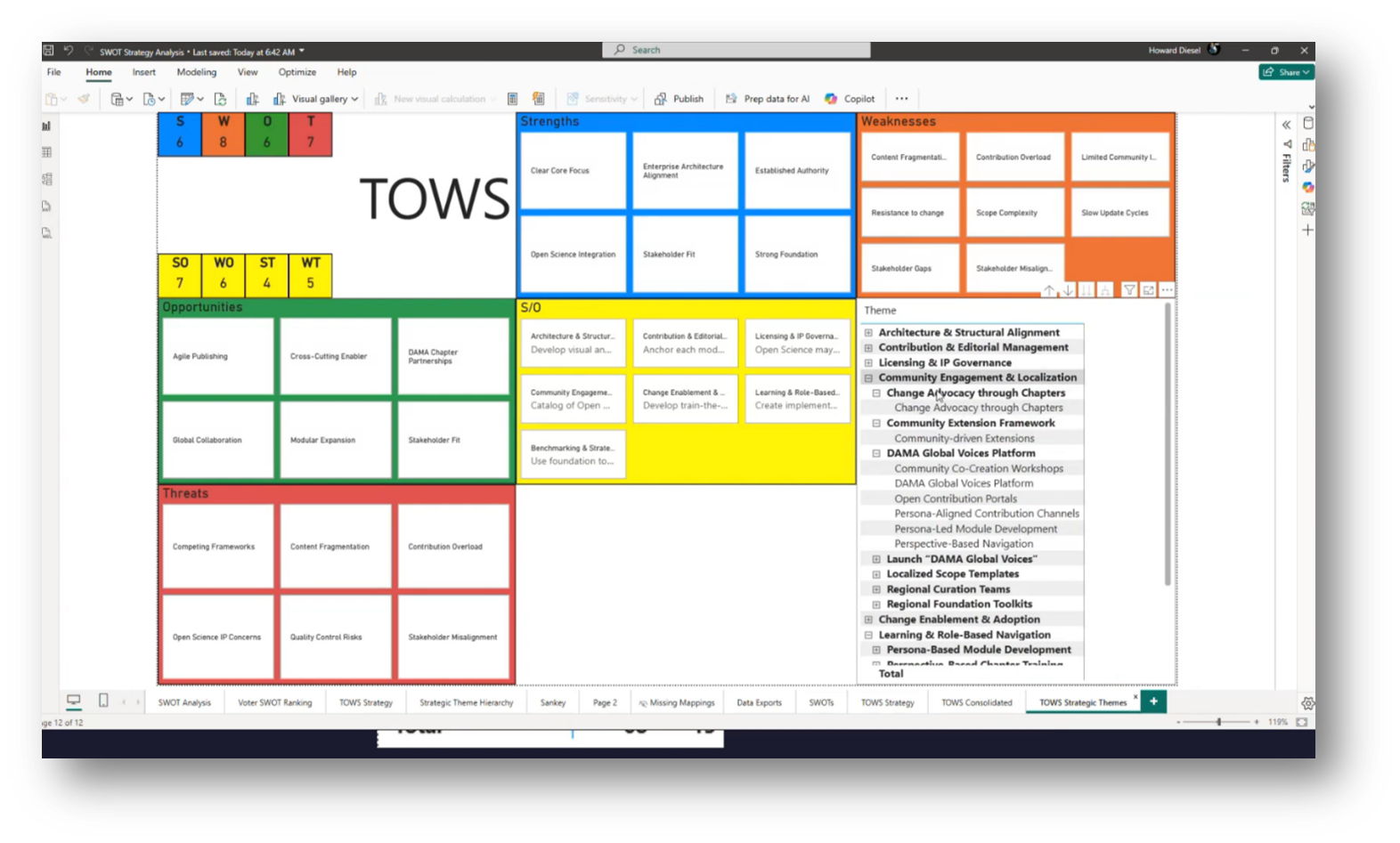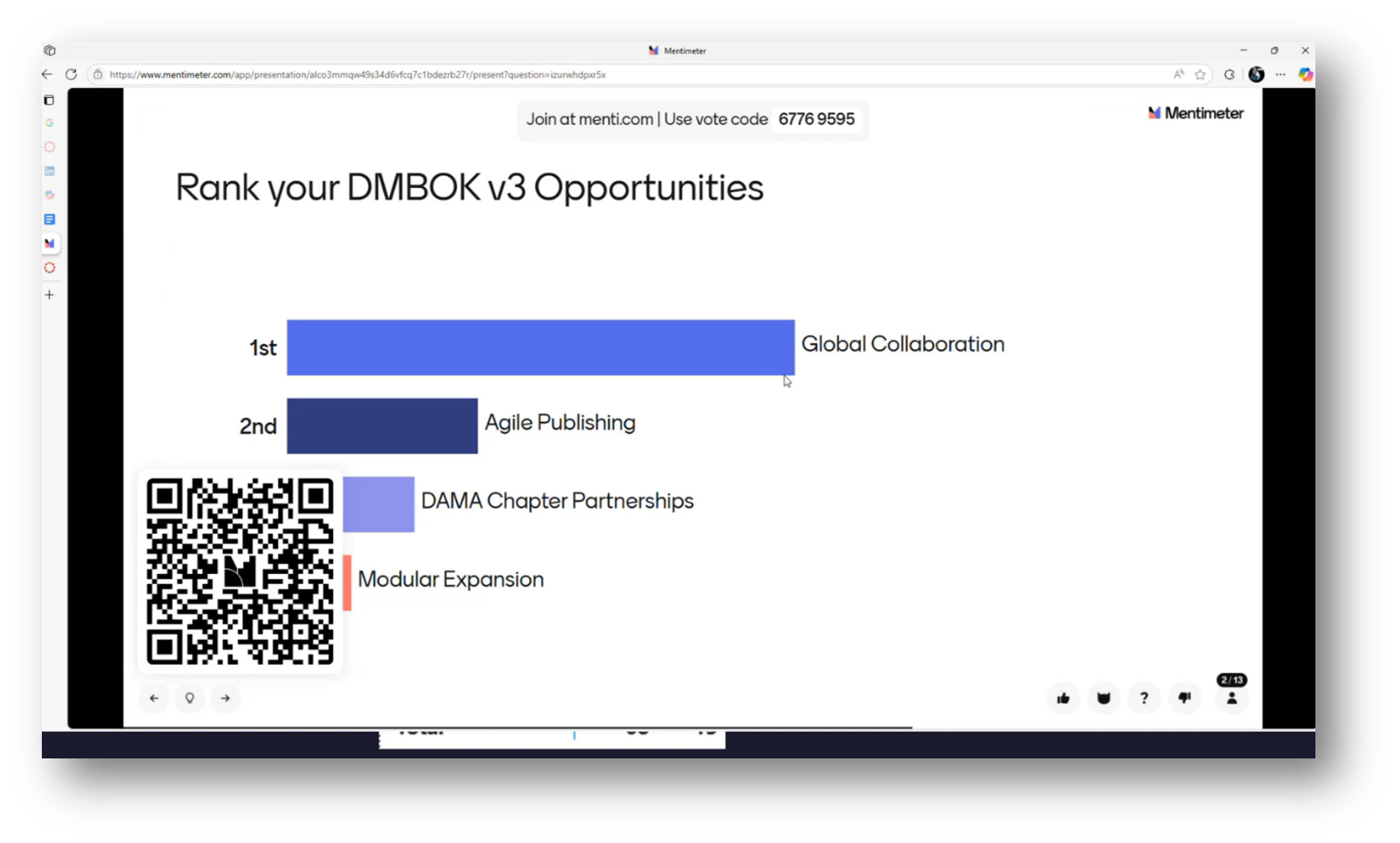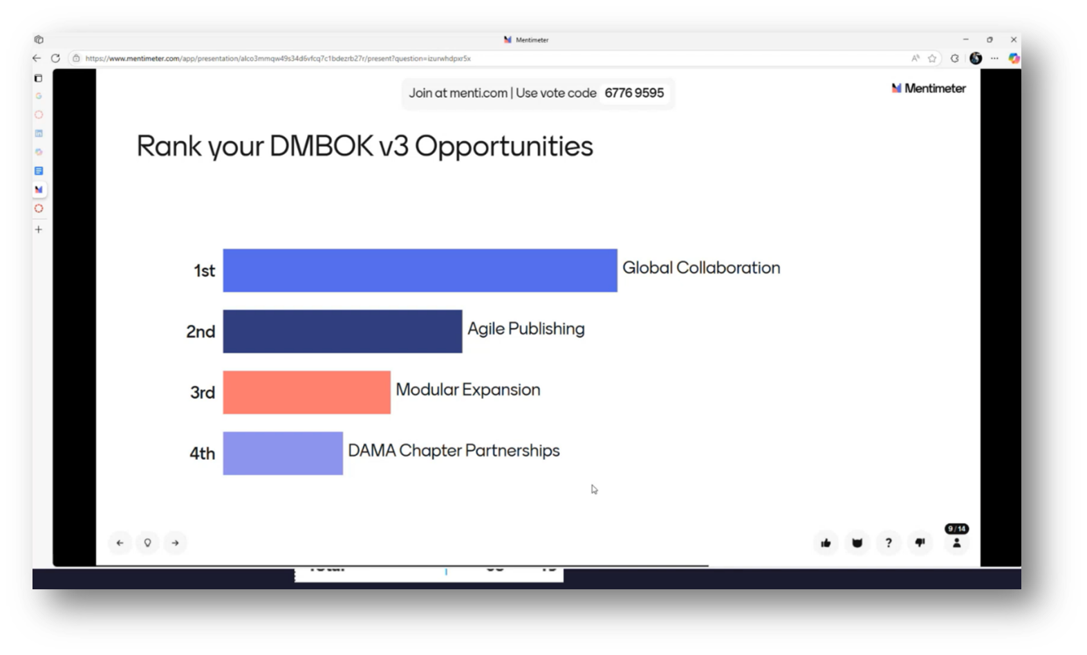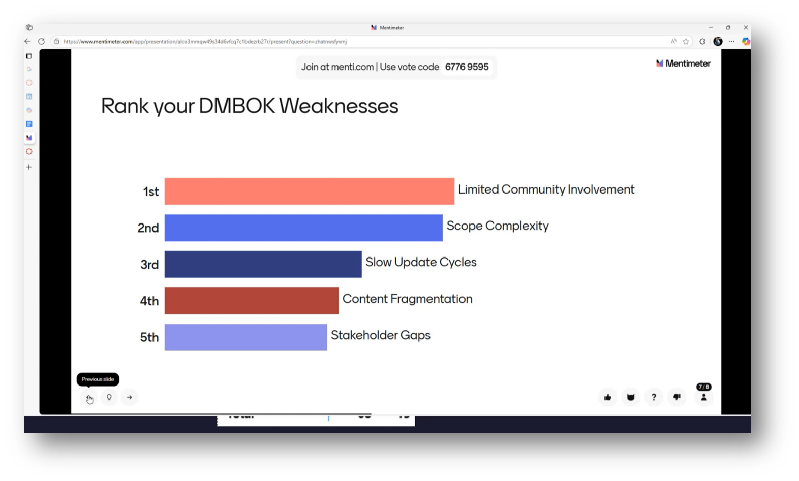 Howard Diesel opened the webinar with the focus of continuing the review of the DMBoK versions two and three. He thanked the attendees for the valuable feedback and support in identifying areas missing from the main team slides. Additionally, he included a ranking of standardised strengths, weaknesses, opportunities, and threats (SWOT), and requested participation in a mentee quiz to gather additional rankings.