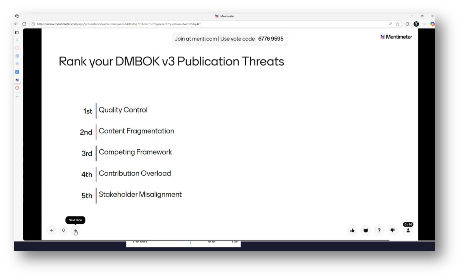 An attendee suggested that, as developments like DMBoK 3 emerge, careful positioning of ownership rights will be necessary to ensure equitable treatment for all contributors involved. Additionally, there’s a focus on the importance of quality control in managing these issues.