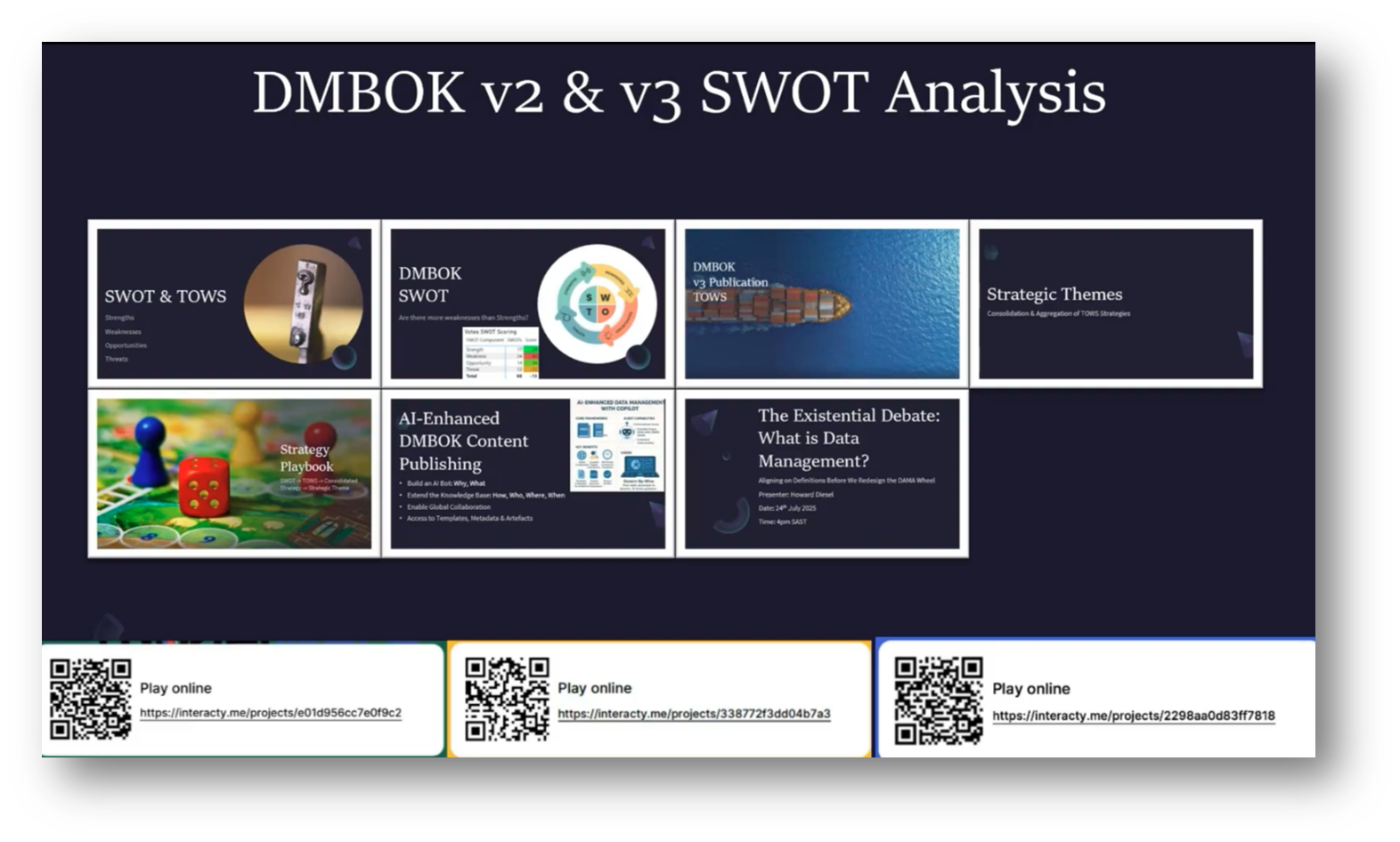Howard then focused on the DAMA Wheel, which features governance at its centre, serving as a key framework for considering various knowledge areas and their integration. It was noted that there is an enhanced version of the DAMA Wheel, and a comparison was made to its structure, resembling a clock. The importance of data governance was emphasised, indicating that it should be addressed first in the overall framework, suggesting a potential shift in approach seen in DMBoK 2.