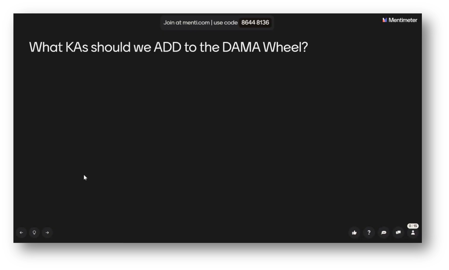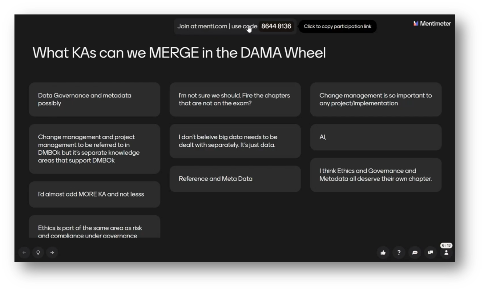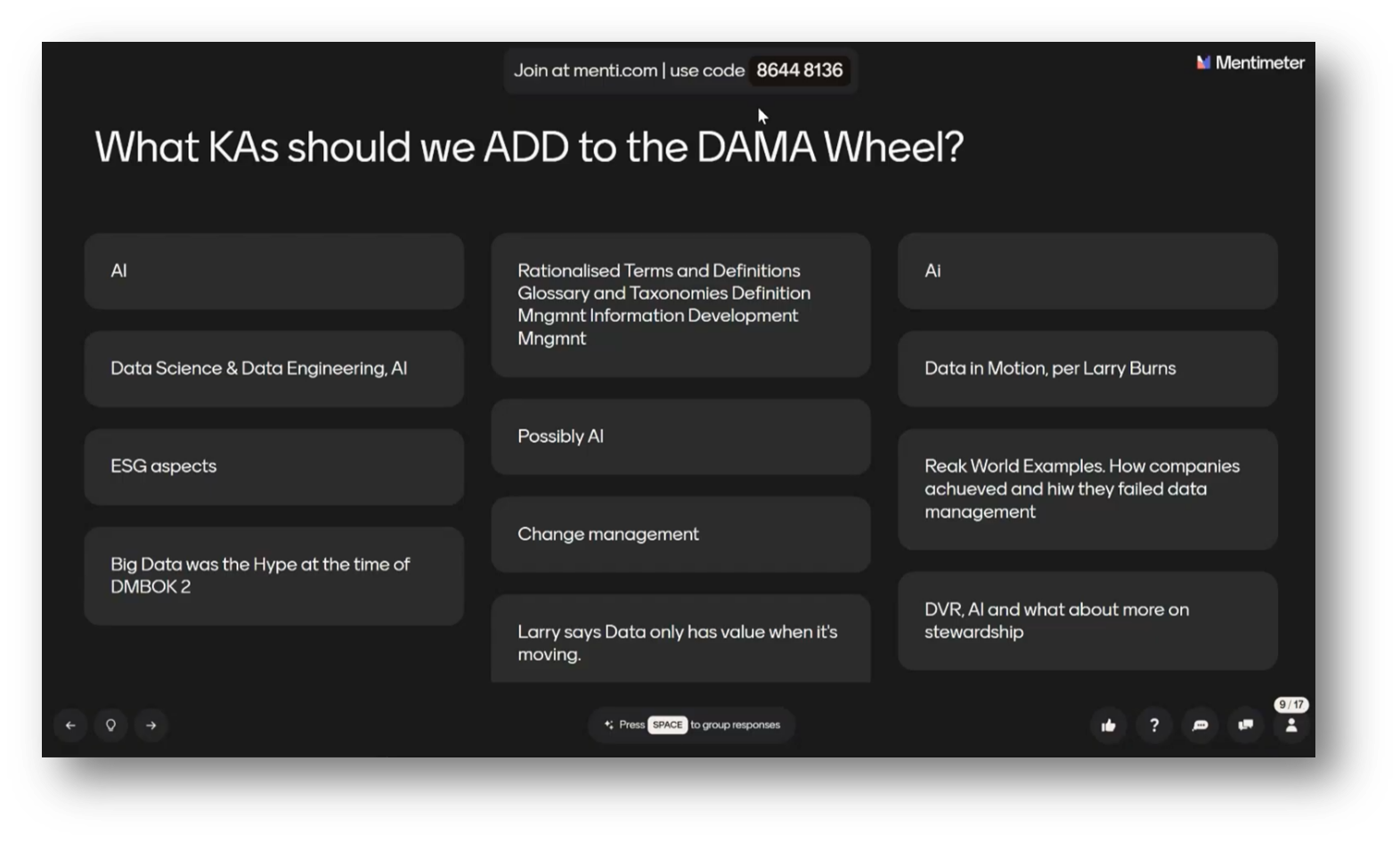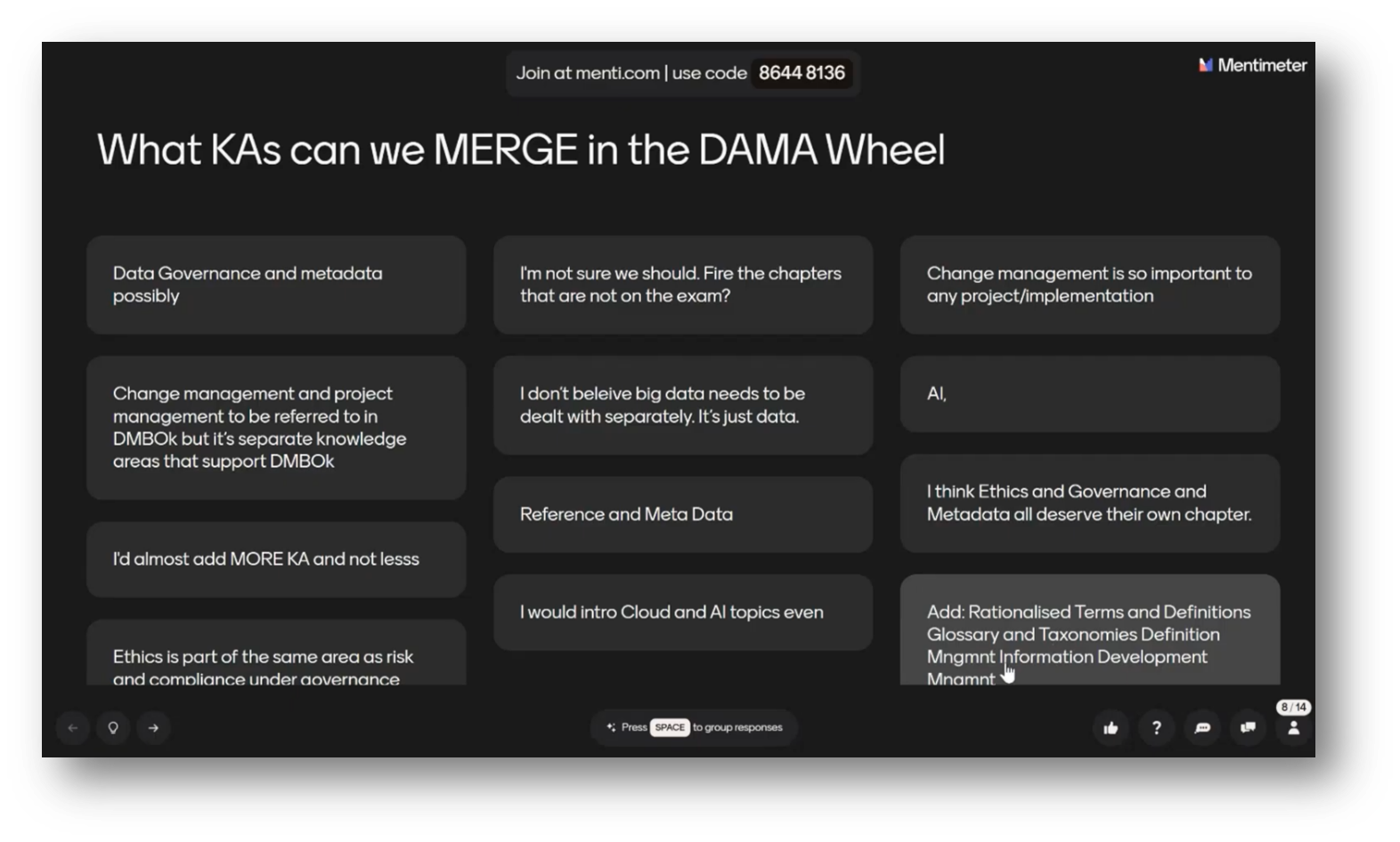 During the continued discussion about the DAMA Wheel, Howard and the attendees debated the potential removal of knowledge areas, ultimately concluding that none should be eliminated. One notable suggestion came from a data architect who proposed merging data modelling into data architecture, sparking further conversation.