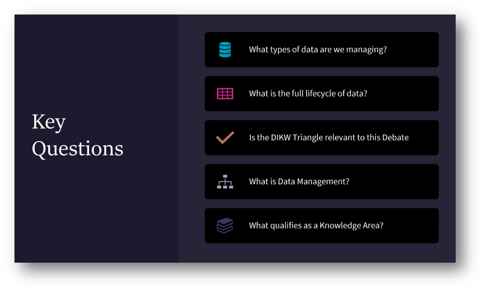 The DIKW triangle illustrates the progression from data to information, then to knowledge, and ultimately to wisdom, which feeds back into planning. Howard noted that there is a debate regarding whether data management should encompass all four elements—data, information, knowledge, and wisdom. Additionally, the key questions are whether there is agreement on this approach and what the full lifecycle of data management should entail, including the types of data being managed. Howard added that addressing these fundamental questions is essential for defining effective data management strategies.