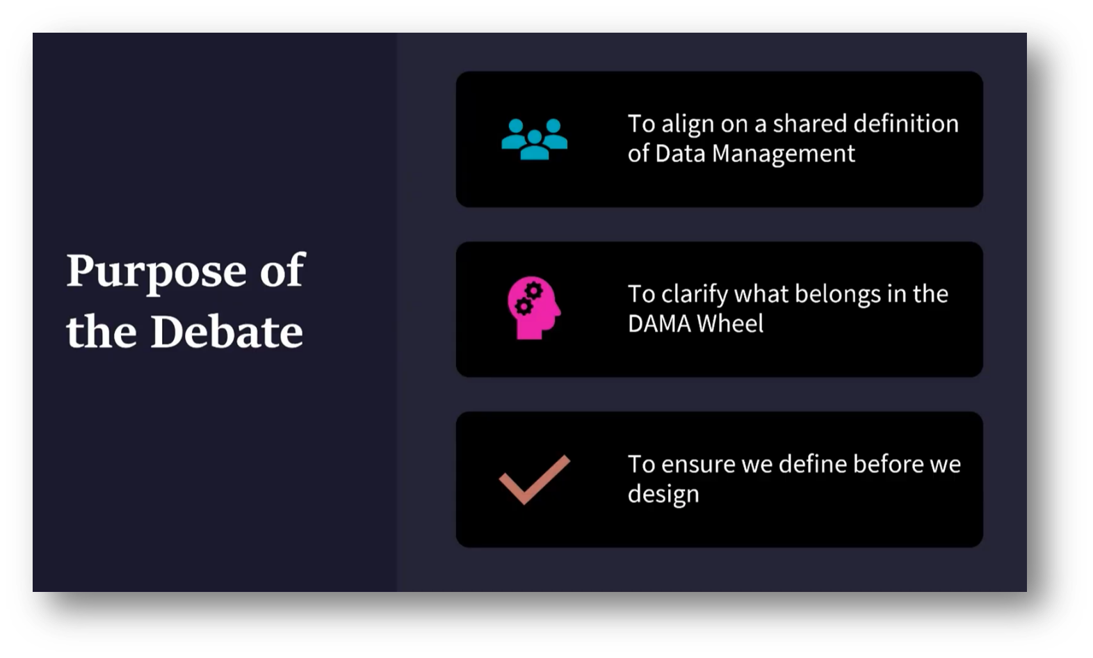 The webinar focused on the definition and understanding of data management as a complex and often debated topic. Howard compared it to foundational mathematical concepts, such as proving that 1 + 1 = 2. Many professionals, such as industrial engineers, frequently engage in these discussions, reflecting on various frameworks, including the Daima wheel, to structure their thoughts. While some individuals may feel familiar with the principles of data management, they acknowledge that their understanding can be influenced by existing frameworks, which might not always capture the full intricacies of the subject. Engaging in these debates enriches the understanding of data management beyond its surface-level definitions.