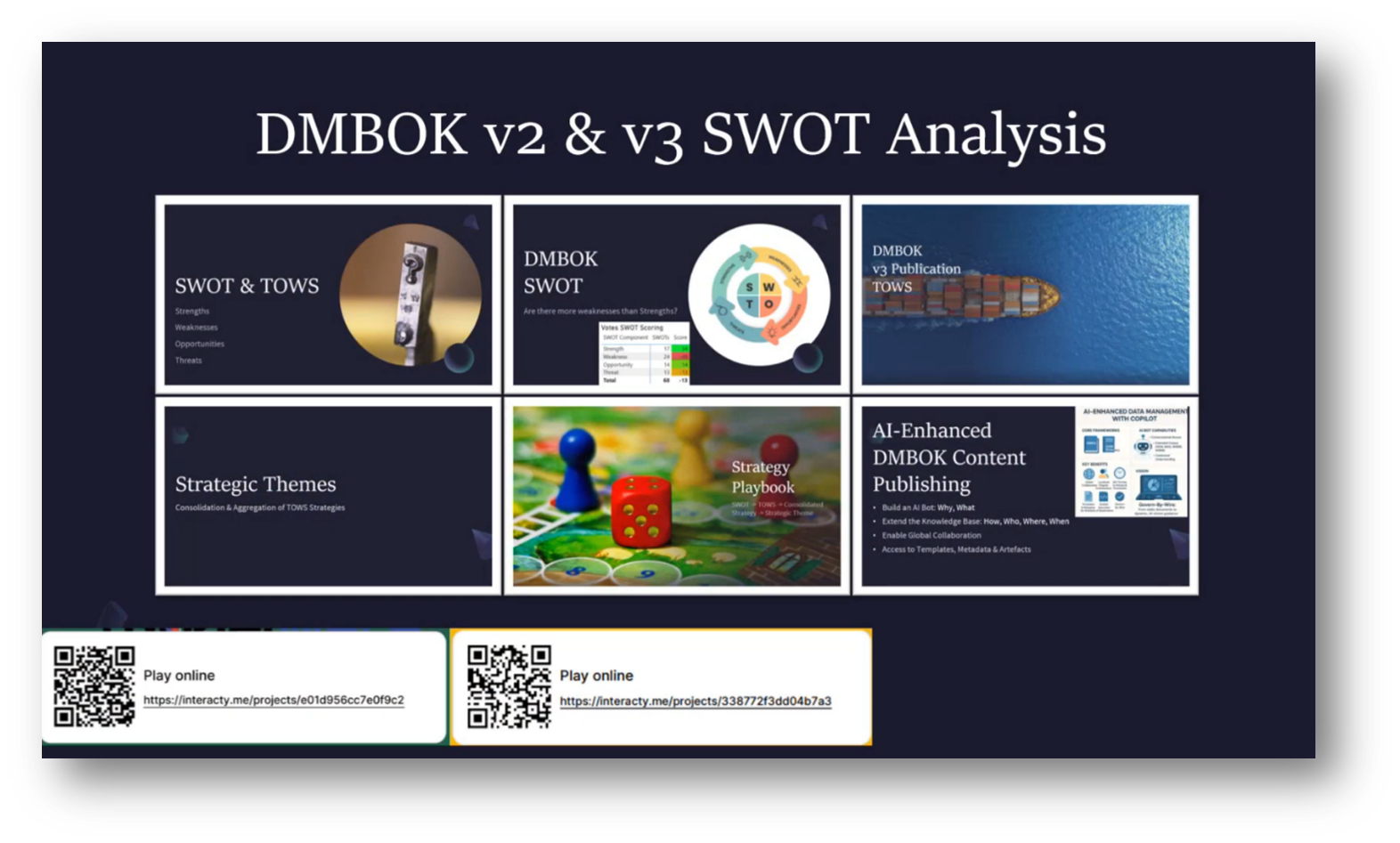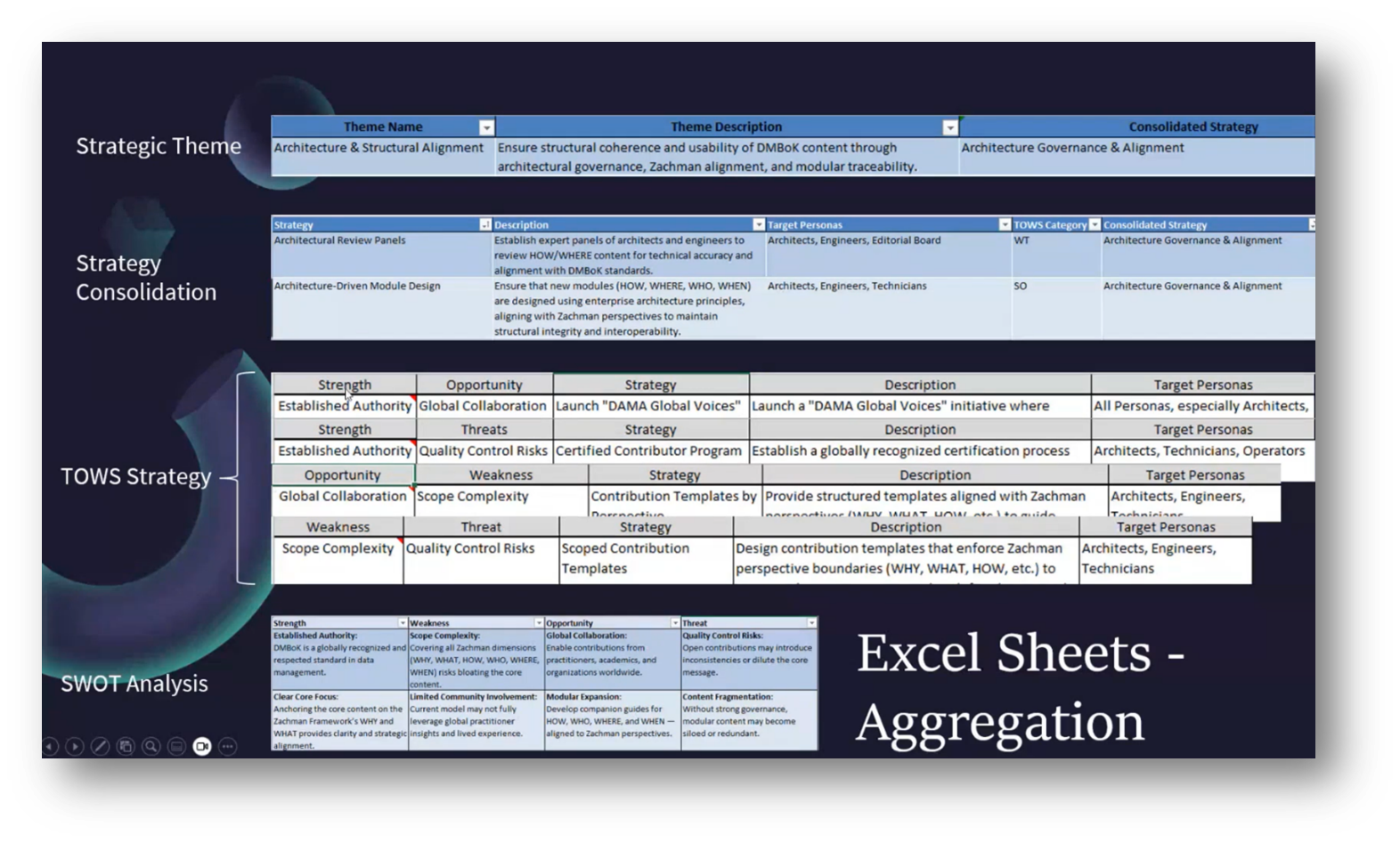 This comprehensive evaluation generated 136 strategies, which were subsequently consolidated into a strategic theme. The team reviewed this theme during discussions to explore ways to expand outreach and increase participation in the DMBoK.