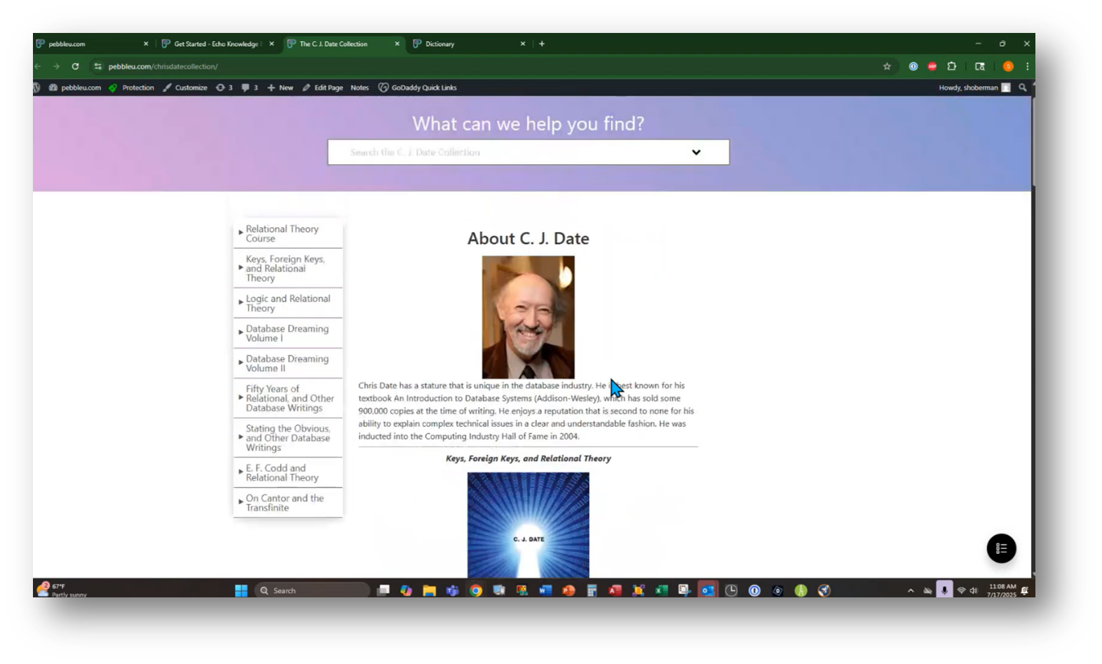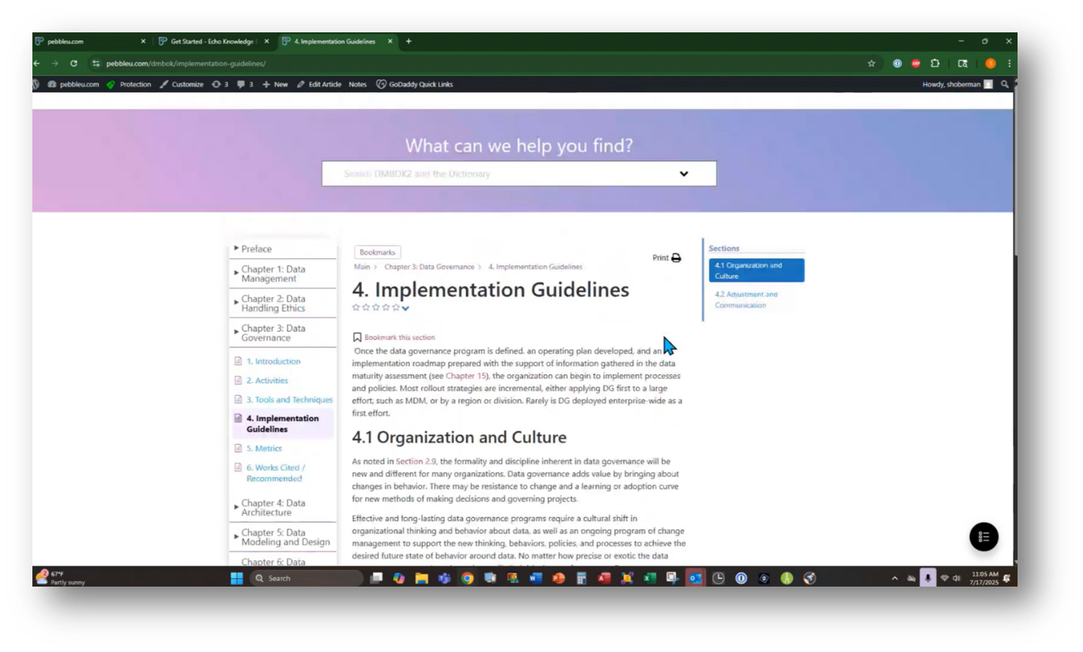 Howard shared that there was an ongoing discussion about presenting a web-based interface for the DMBoK, similar to a project he was working on that involved a chatbot created using Lovable. He then sought clarification on the presentation format, while Steve Hoberman was encouraged to showcase a related website called "PebbleU."